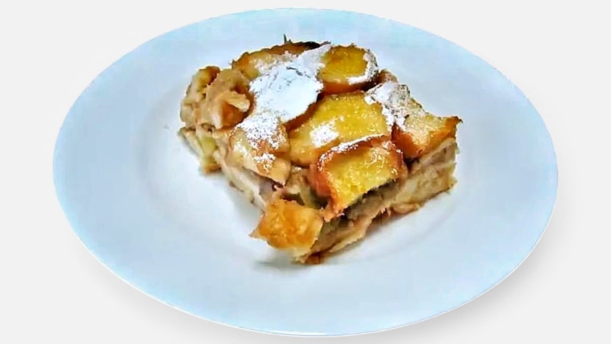 Žemlovka s jablky a skořicí posypaná cukrem.