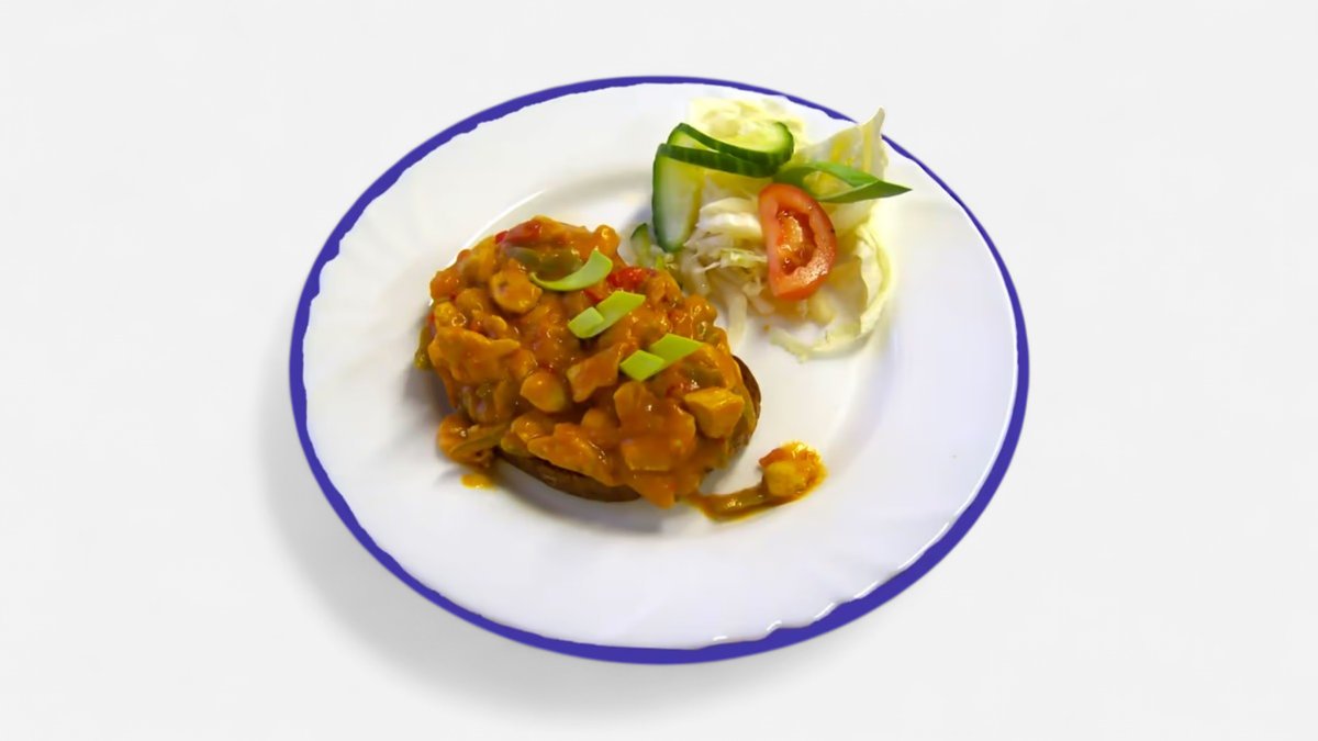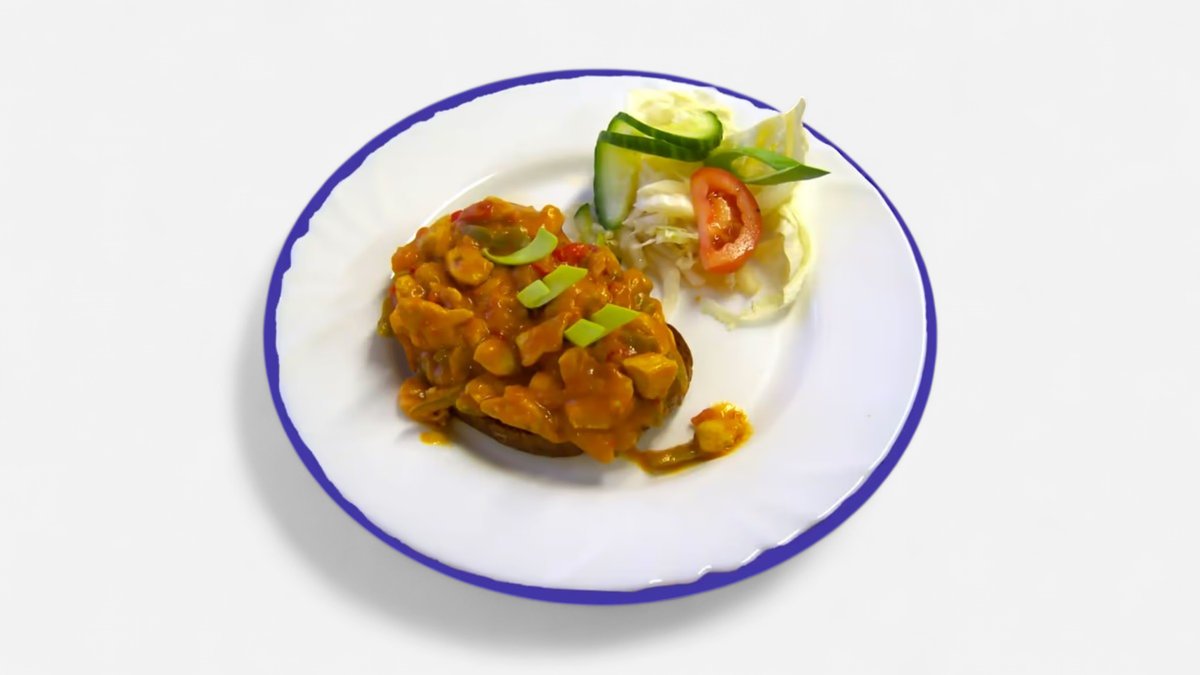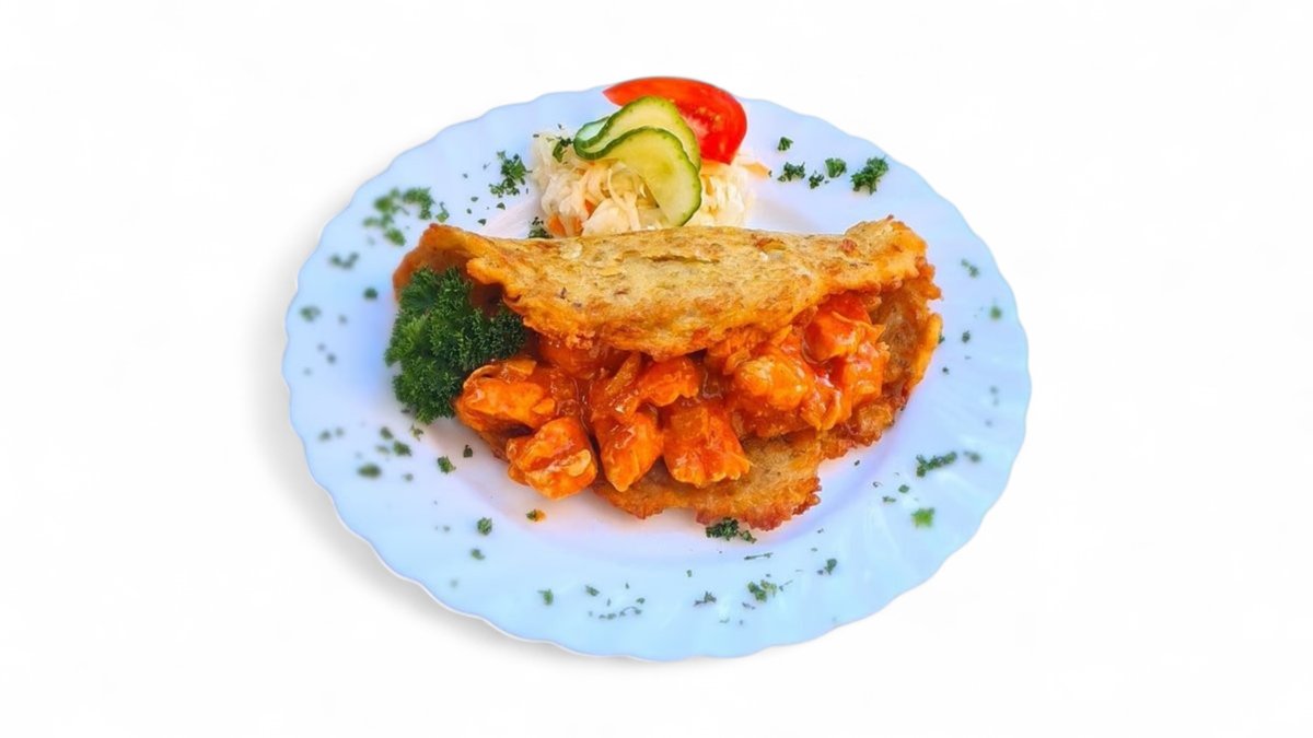 300g Placek s domácího bramborového těsta plněný kuřecím masem, zeleninová obloha