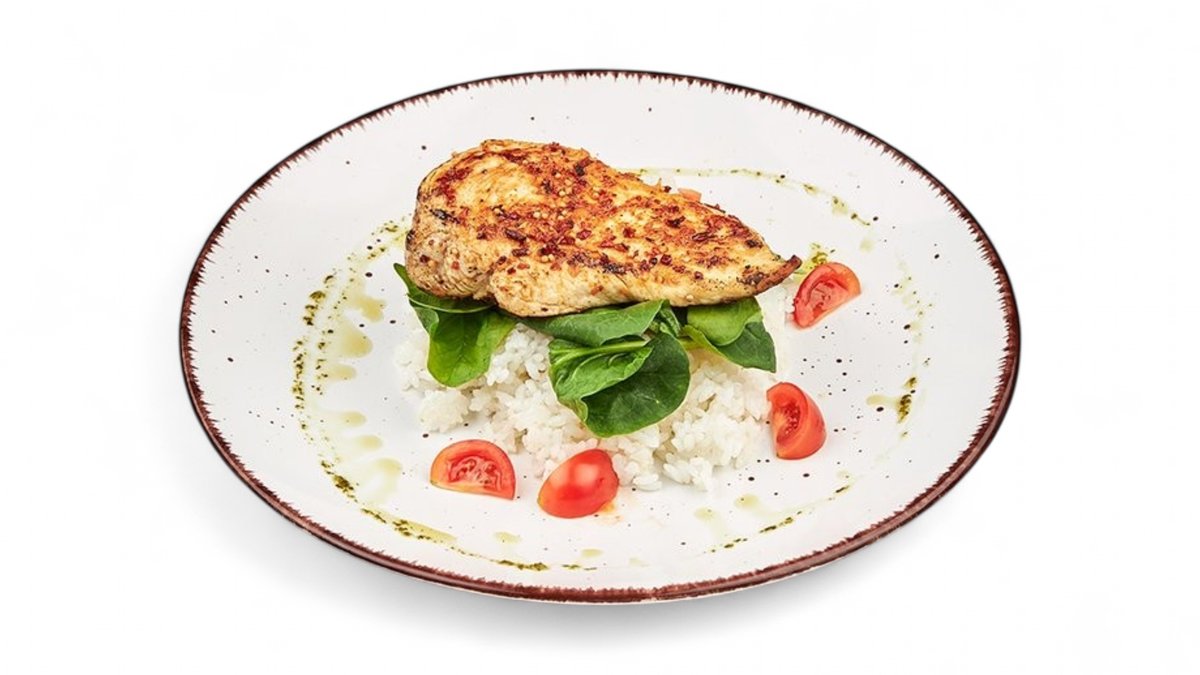 150g Steak z kuřecího prsa zapečený ananasem a sýrem, zeleninová obloha, příloha dle vlastního výběru