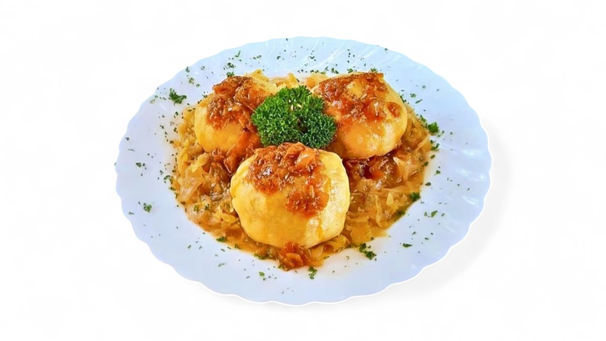 250g Bramborové knedlíky plněné uzeným masem, dušené zelí