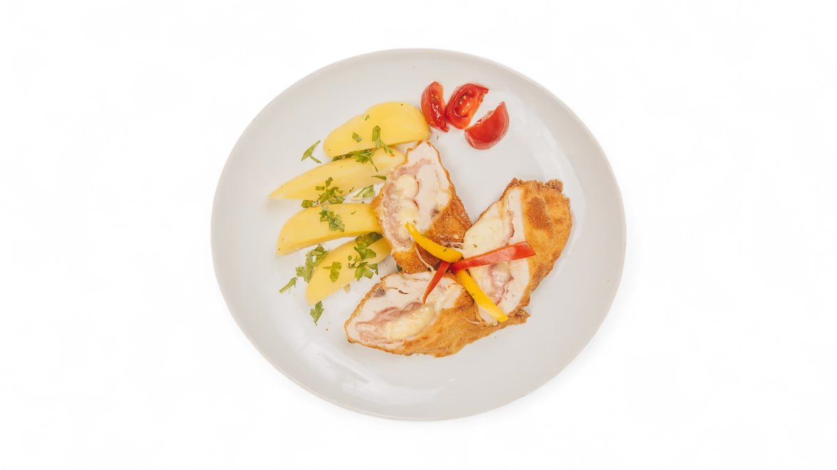 150g Smažená kapsa z kuřecího prsa, plněná 30g šunkou a 20g hermelínem, příloha dle vlastního výběru