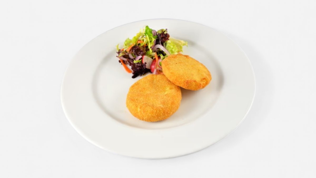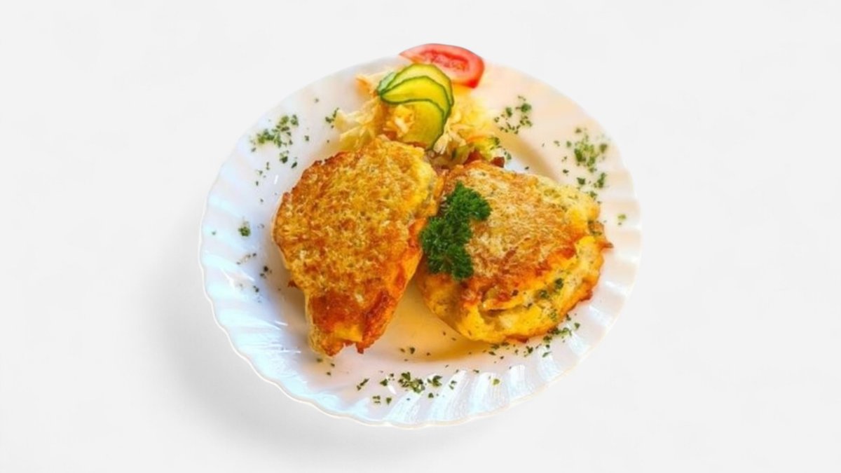 2 ks 50g Hermelínu v bramborovém placku z domácího těsta, zeleninová obloha.