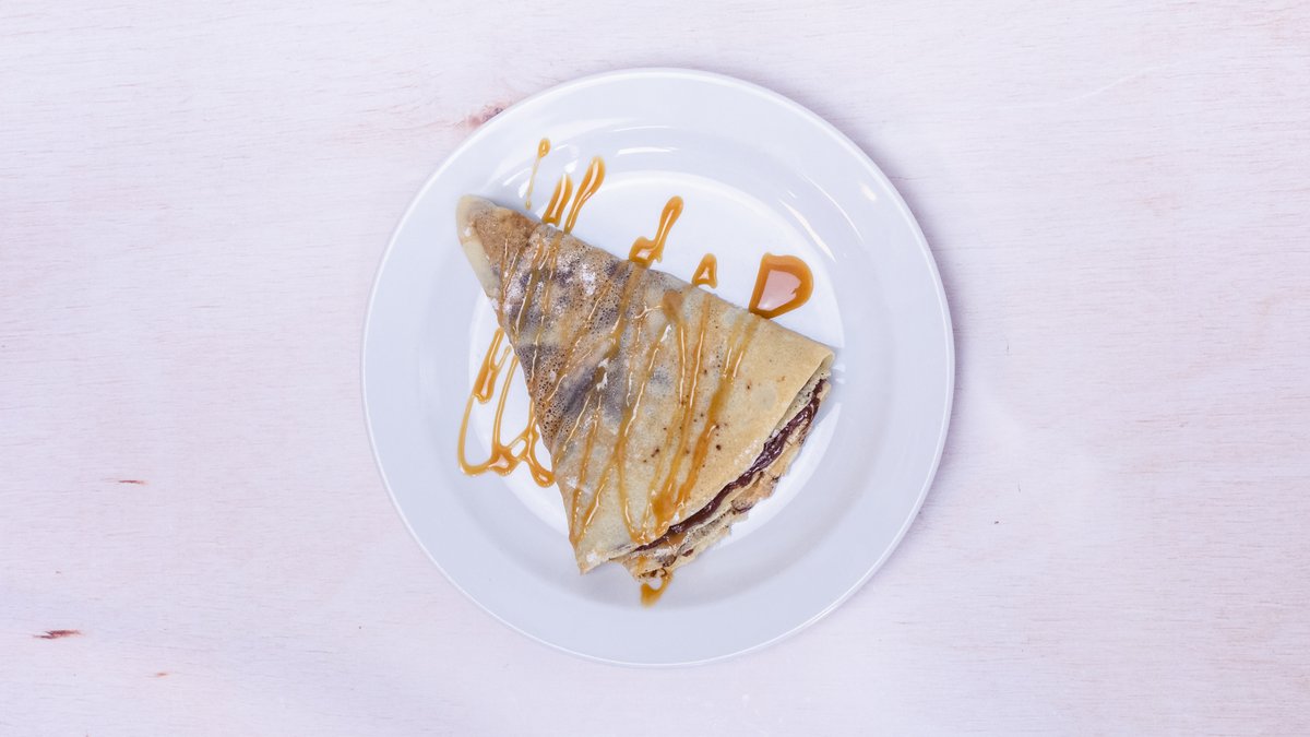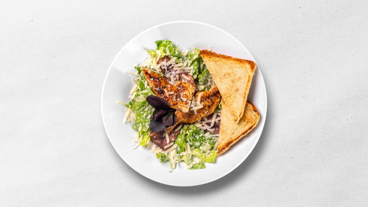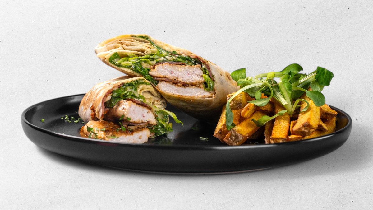 caesar tortila s kuřecím masem, rozpékanou slaninou, rajčaty a parmezánem