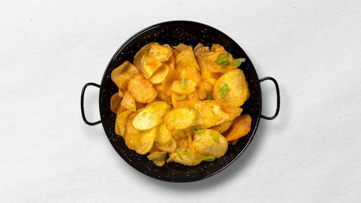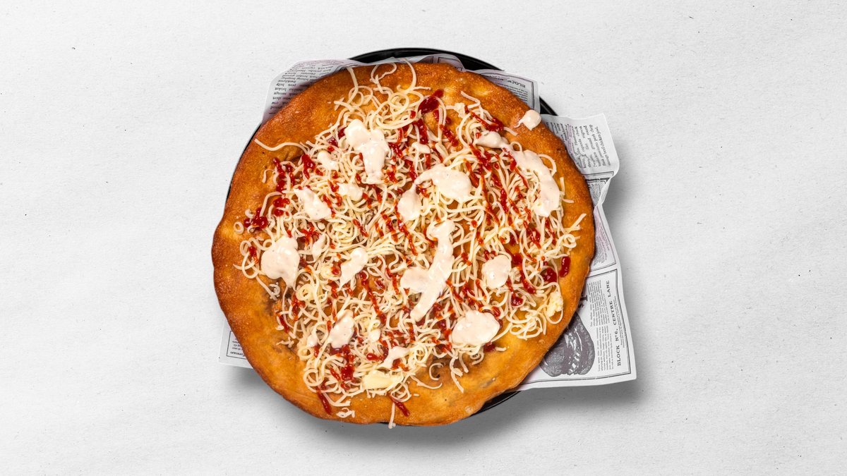 900g Ztrhané maso, domácí hranolky, zauzená majonéza, čedar , Smažená cibulka (Jedná se o hranolky polité masovým výpekem, sypané trhaným kuřecím masem a to vše zapečené čedarem a zalité zauzenou majonézu, sypané smaženou cibulkou )
