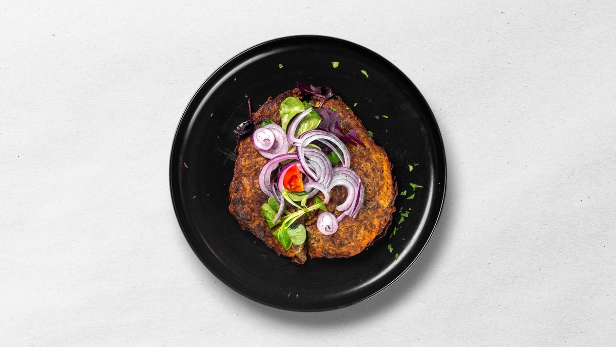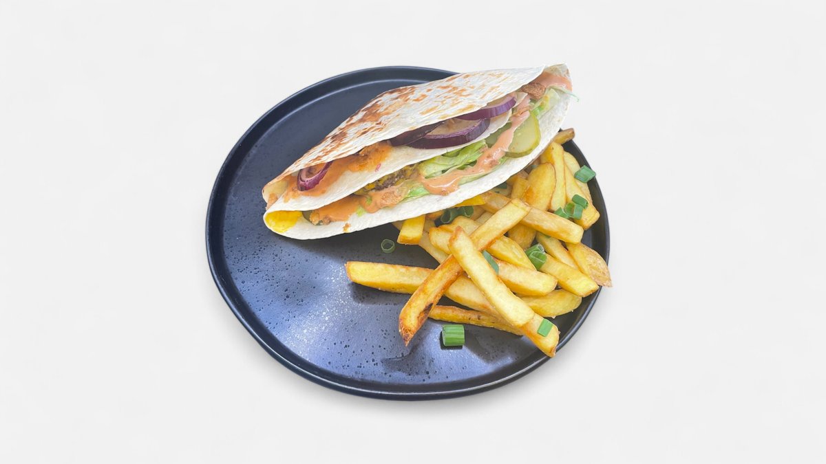 200g Hovězí mleté maso v tortille, červená cibule, nakládaný okurek , červená cibulka , čedar , Dijonská omáčka, salát, hranolky
