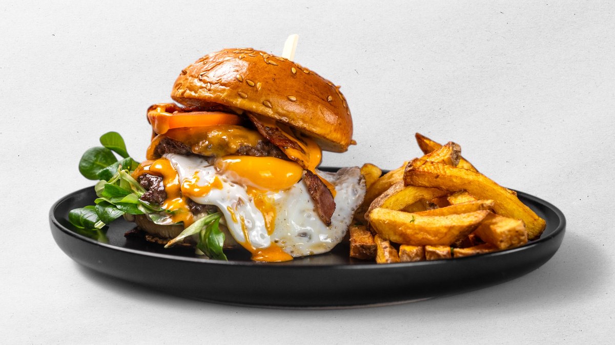 2x 150g hovězí maso , sázené vejce , slanina , rajče , francouzská omáčka , dijonská omáčka , salát , sezamová bulka a domácí hranolky