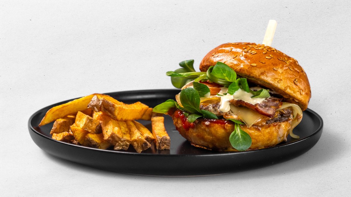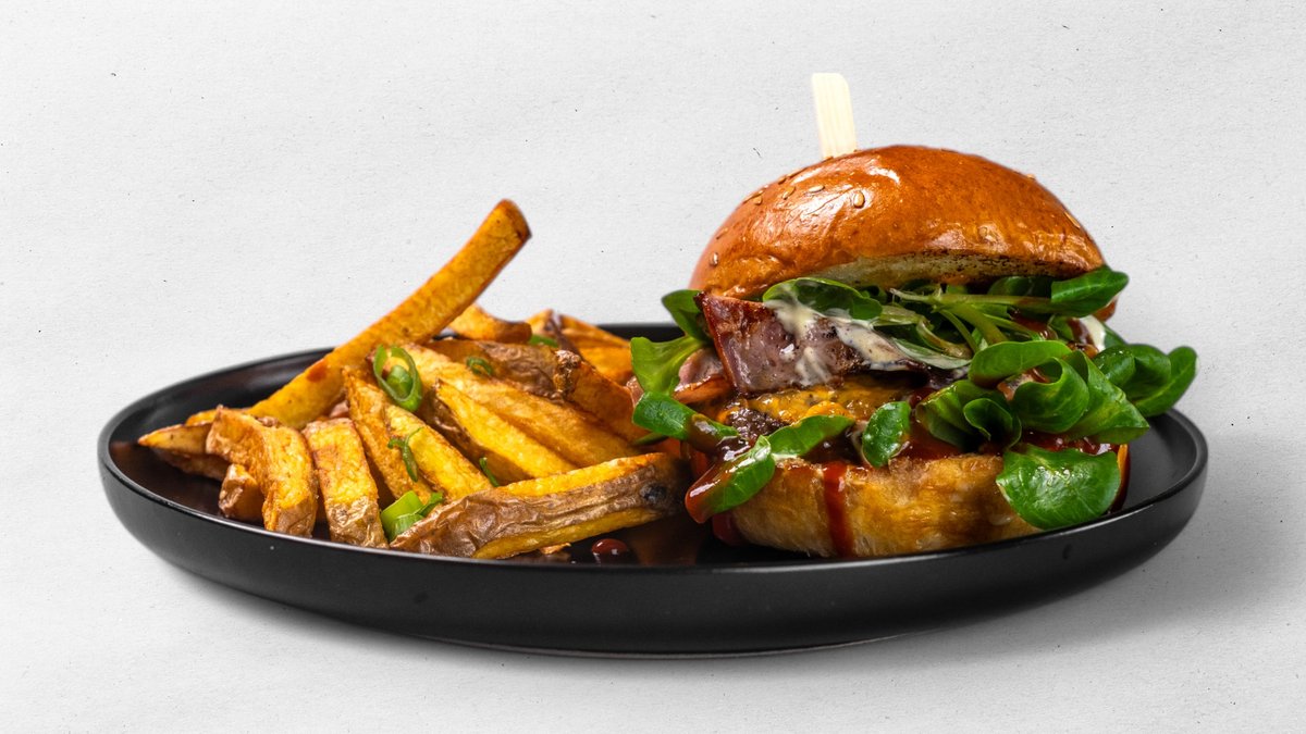 200g hovězí maso , slanina , čedar , BBQ omáčka , dijonská omáčka , salát , sezamová bulka a domácí hranolky