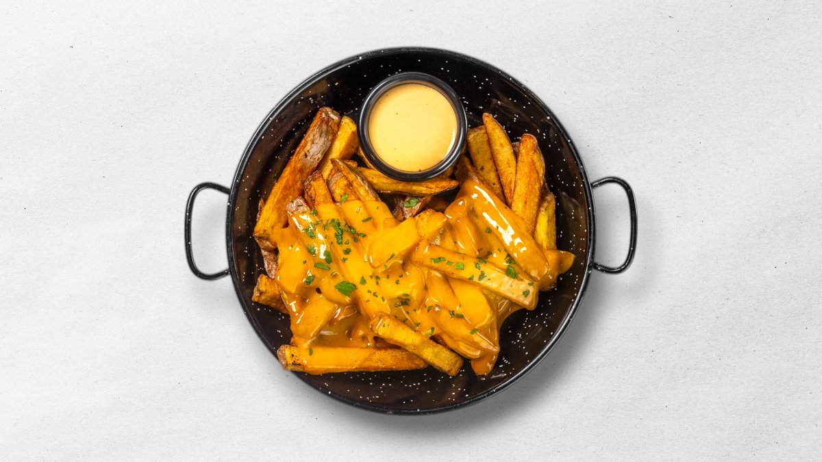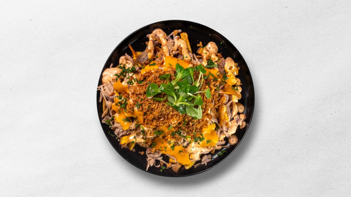 900g Ztrhané maso, domácí hranolky, zauzená majonéza,čedar, Smažená cibulka (Jedná se o hranolky polité masovým výpekem, sypané trhným hovězím masem a to vše zapečené čedarem a zalité zauzenou majonézou, sypané smaženou cibulkou)