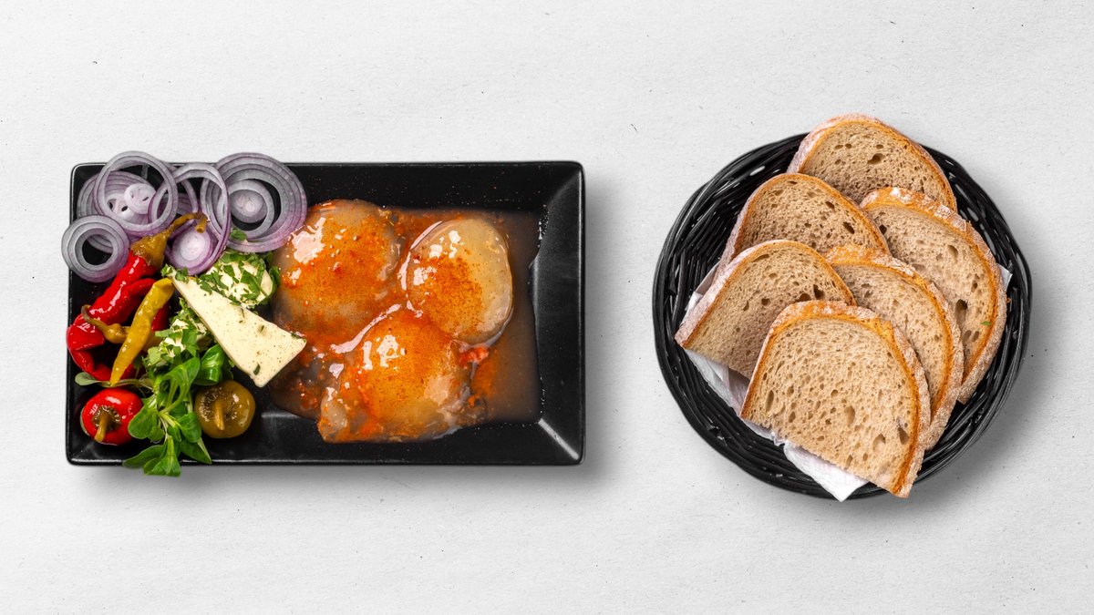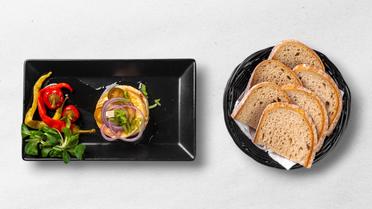 nakládané tvarůžky, máslo, červená cibulka, čerstvý chléb 120g