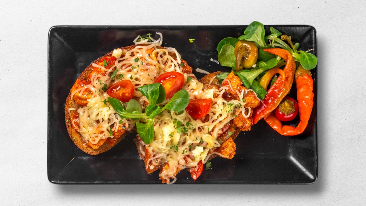 česneková topinka (2ks), pikantní masová směs sypaná sýrem