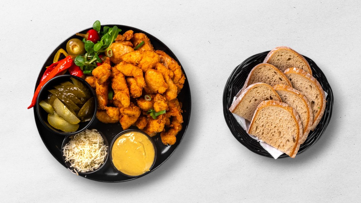 kuřecí řízečky 500g, omáčka 2x, okurky, chléb