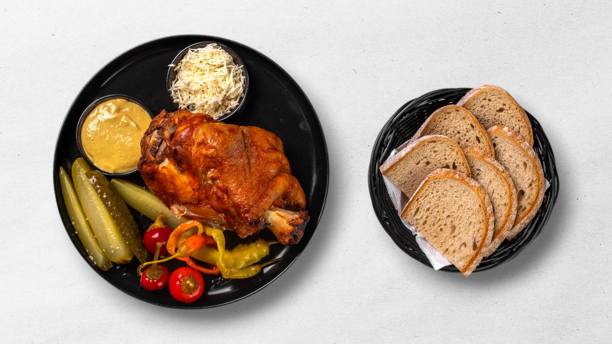 vepřové zadní kolínko s kostí pomalu pečené na černém pivu, kyselé okurky, hořčice, křen, čerstvý chléb 850g