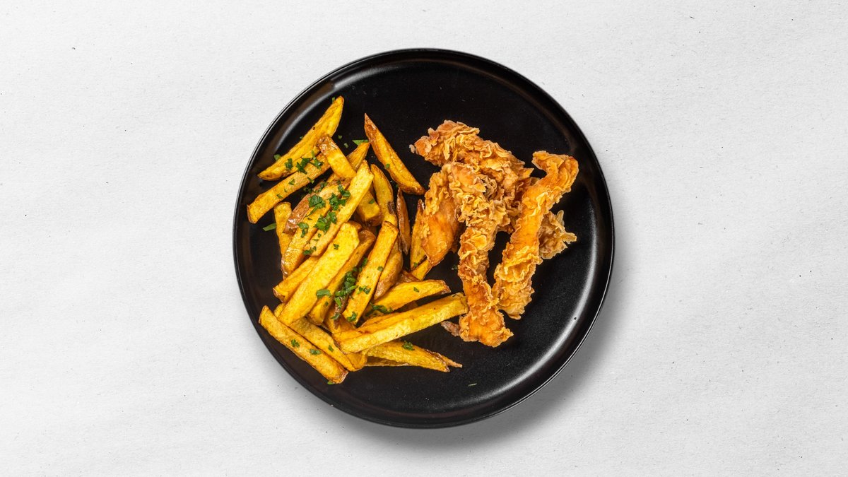 sestavte si vlastní menu: stripsy, domácí hranolky, domácí omáčka,