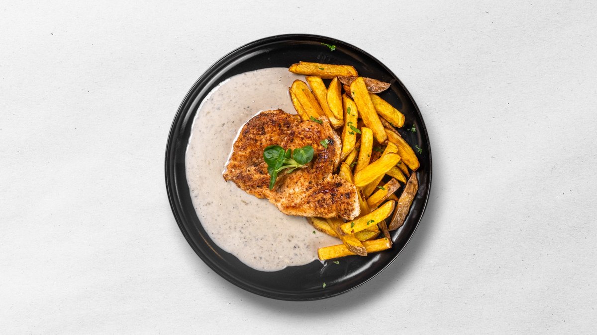 kuřecí prso 200g, rokfórová omáčka, domácí hranolky 150g