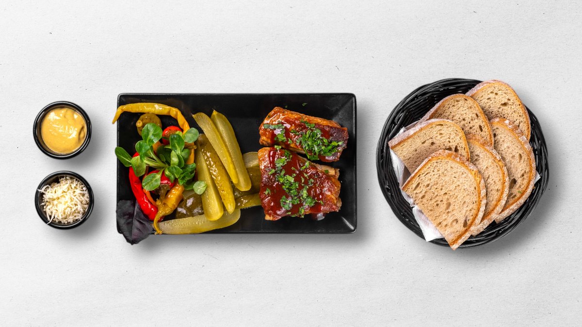 vepřová žebra 300g, křen, hořčice, kozí rohy, čerstvý chléb