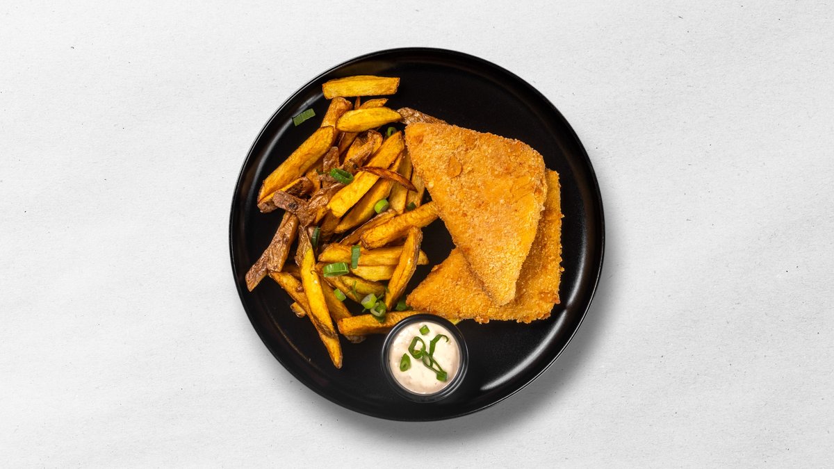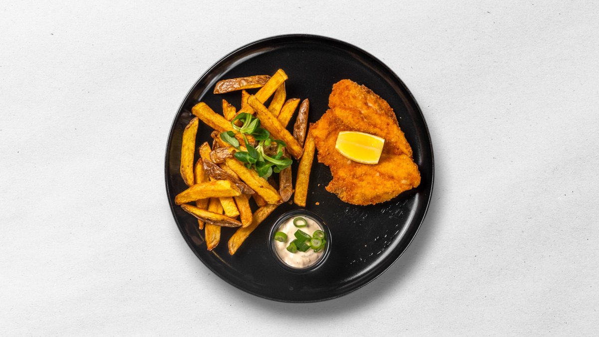 150g Smažený kuřecí řízek , domácí hranolky a tatarská omáčka