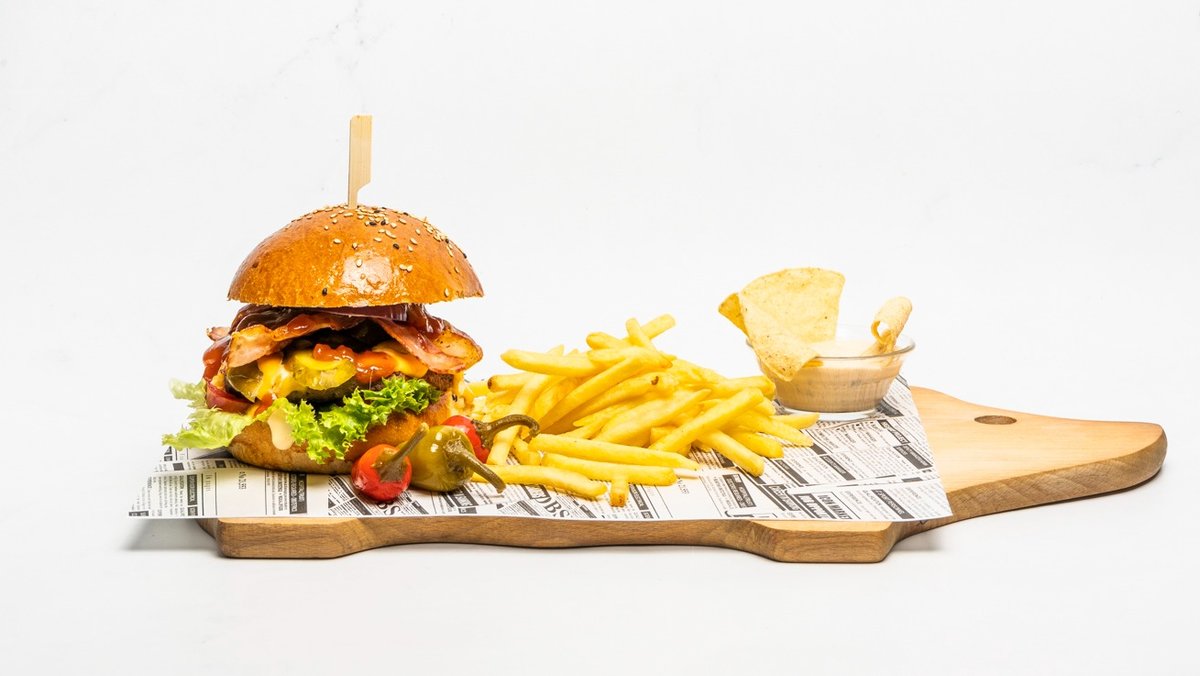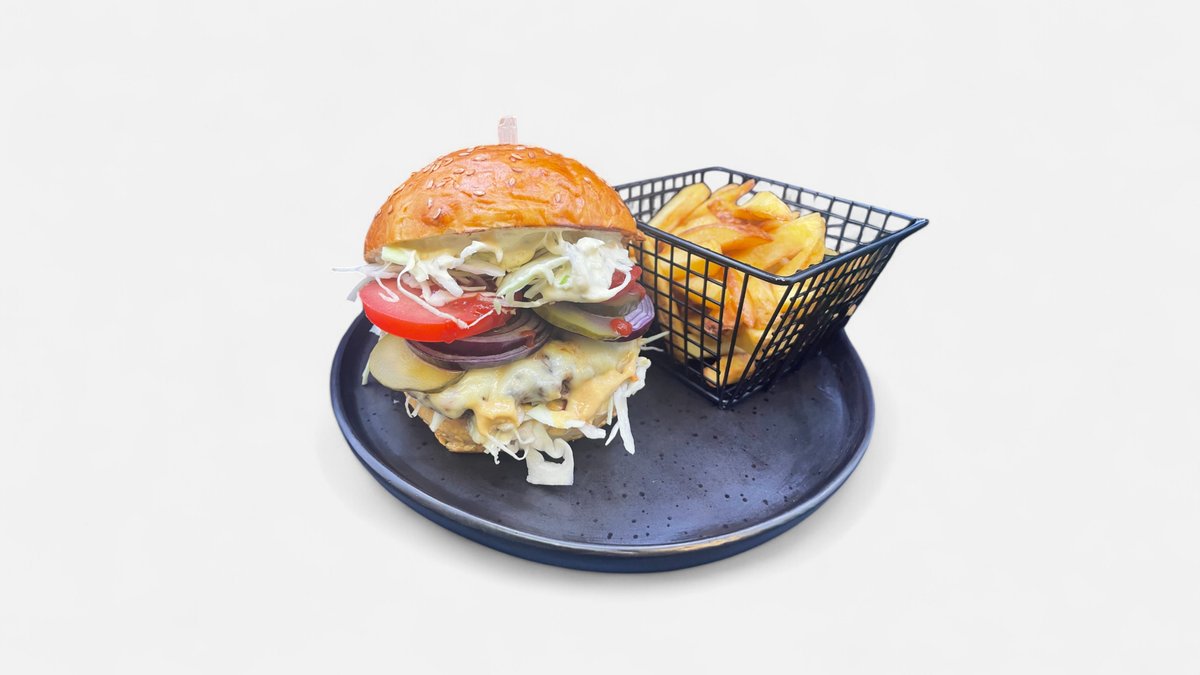 150g hovězí maso , Maasdamer , čedar , gouda , cibule , slanina , kečup , medovohořčičná majonéza , rajče , salát , sezamová bulka a domácí hranolky