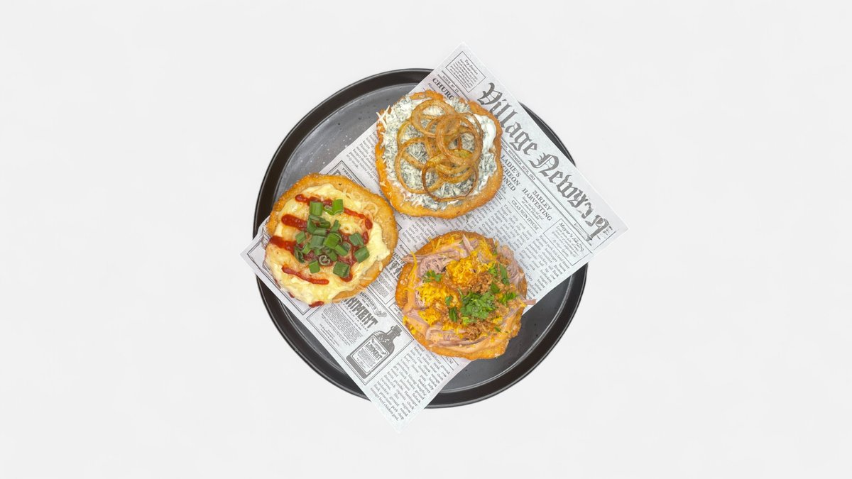 trhané vepřové kolínko, domácí hranolky, zauzená majonéza, čedar, smažená cibulka