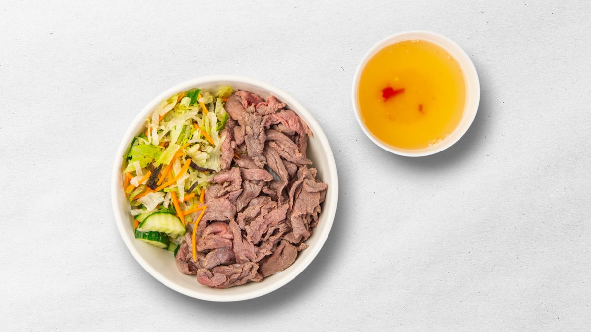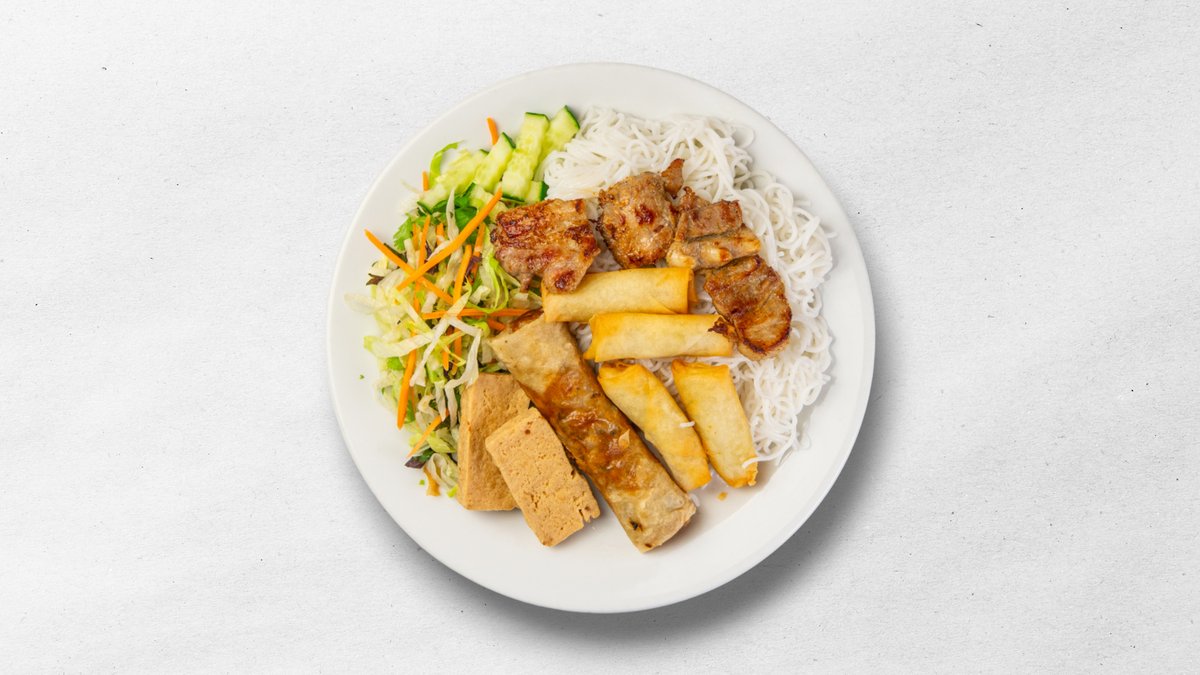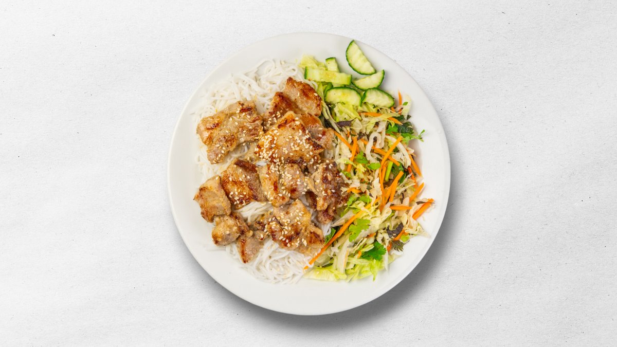 Mix rýžové kulaté nudle, grilované vepřové maso, salát a omáčka.