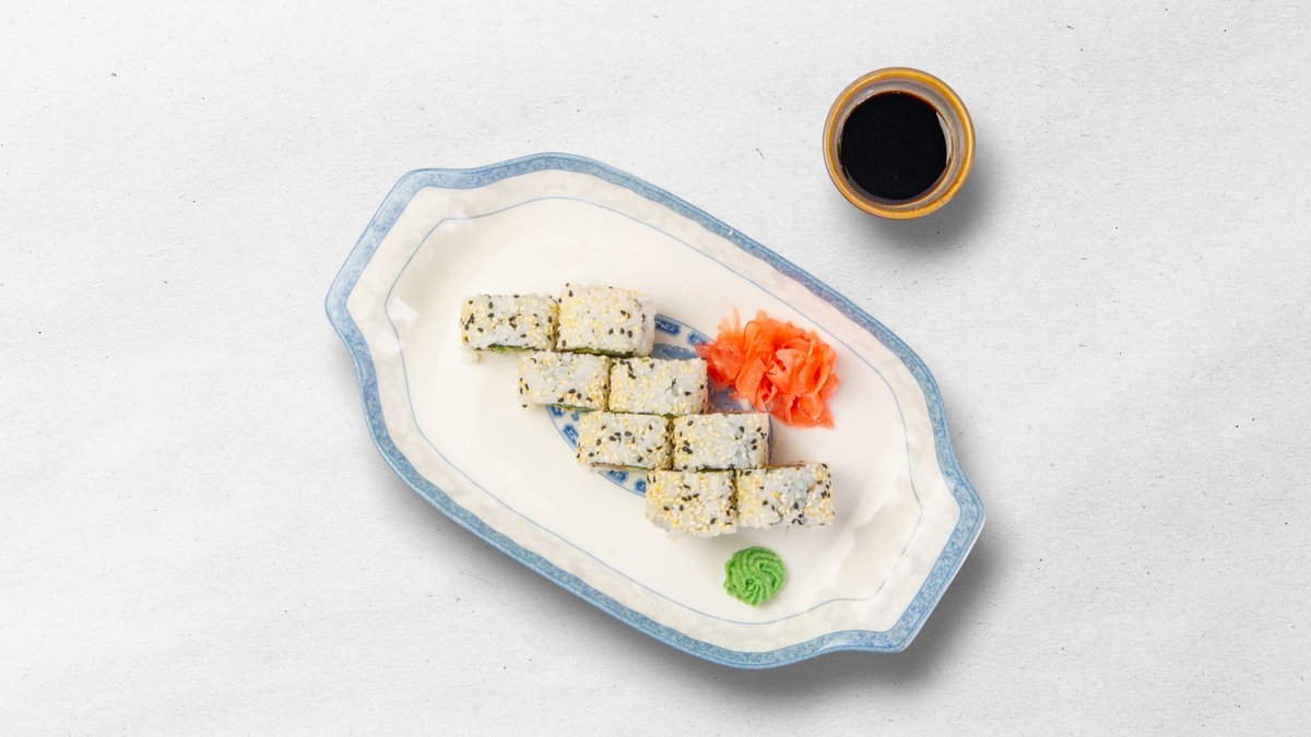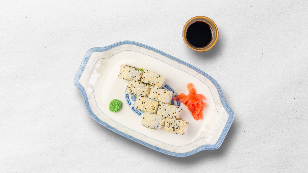 8x maki losos, 8x maki tuňák, 8x maki avokado, 8x california tempura a 8x california krab.