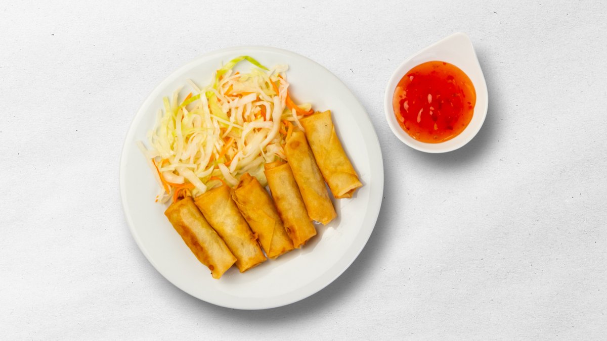 Křupavé veganské mini závitky plněné zeleninou a podávané s dipem.