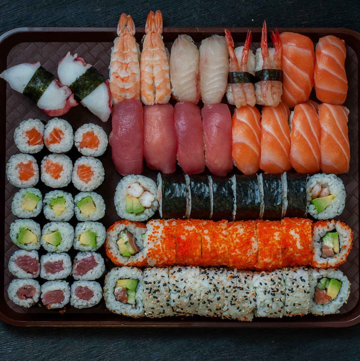 8x maki lasos, Bx maki tuňák, 8x maki krab, 8x california losos a sezam.