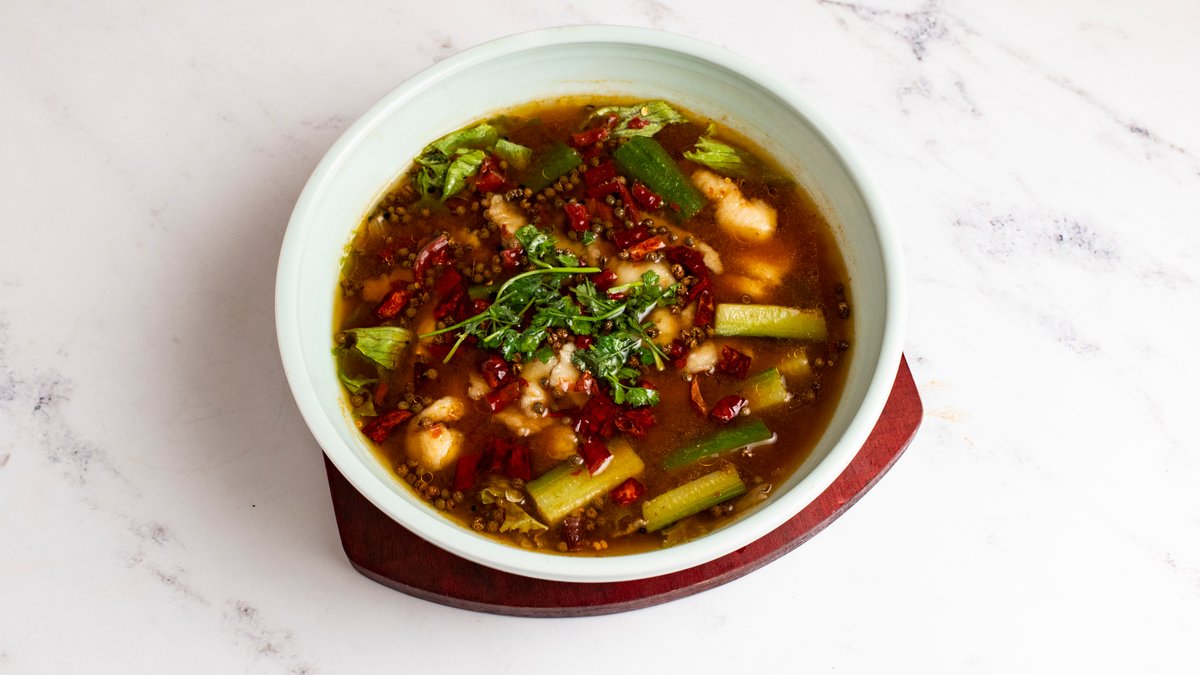 Výrazné sečuánské restované jídlo s chilli, česnekem a ostrým kořením.
