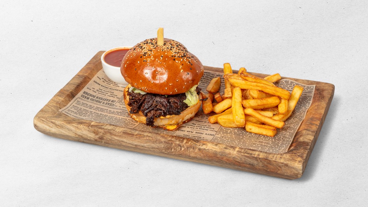 Z hovězího masa, s rokforovým krémem a BBQ omáčkou, se salátem v naší rozpečené bulce, podávané s hranolky se slupkou.