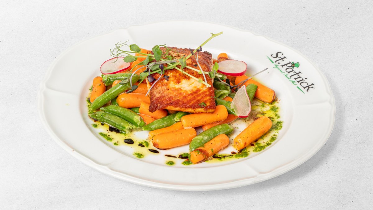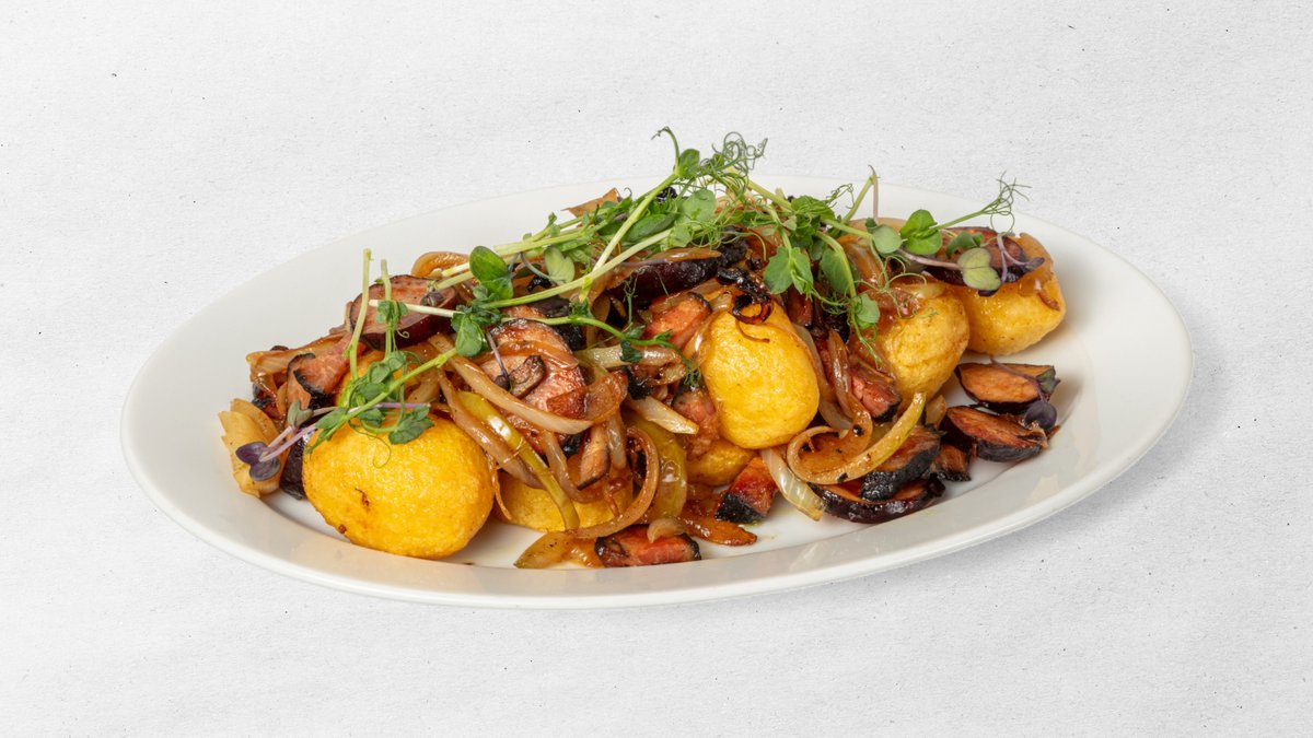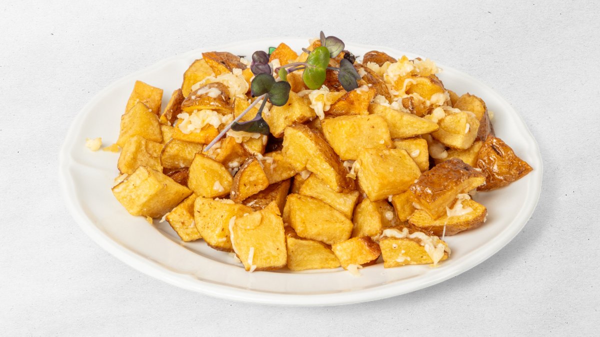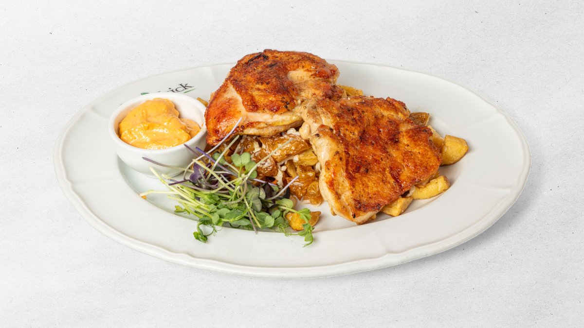S křupavou kůžičkou, podávané s bramborovými kostičkami se sýrem a česnekem a tradiční irskou omáčkou, 400 g.