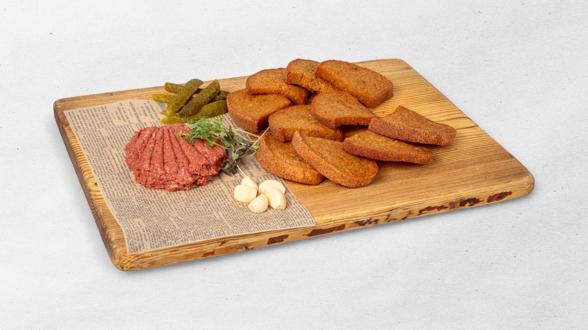 Odleželý v bylinkové lázni, podávaný s opečenou slaninou a pivním sýrem, 300 g.