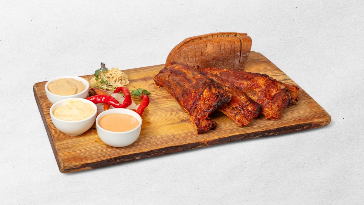 Kuřecí křidélka, cibulové kroužky, grilované klobásky, plněné papričky jalapeños a kořeněné bramborové klínky, servírované v košíku s česnekovým a BBQ dresinkem.
