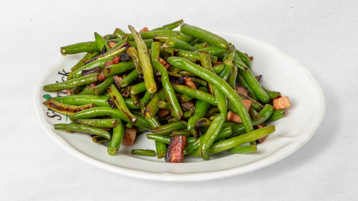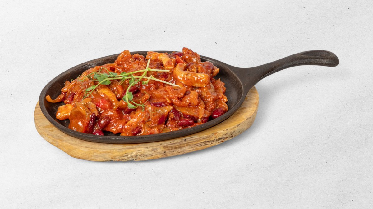 S kousky hovězího a vepřového masa, s červenými fazolemi a zeleninou.