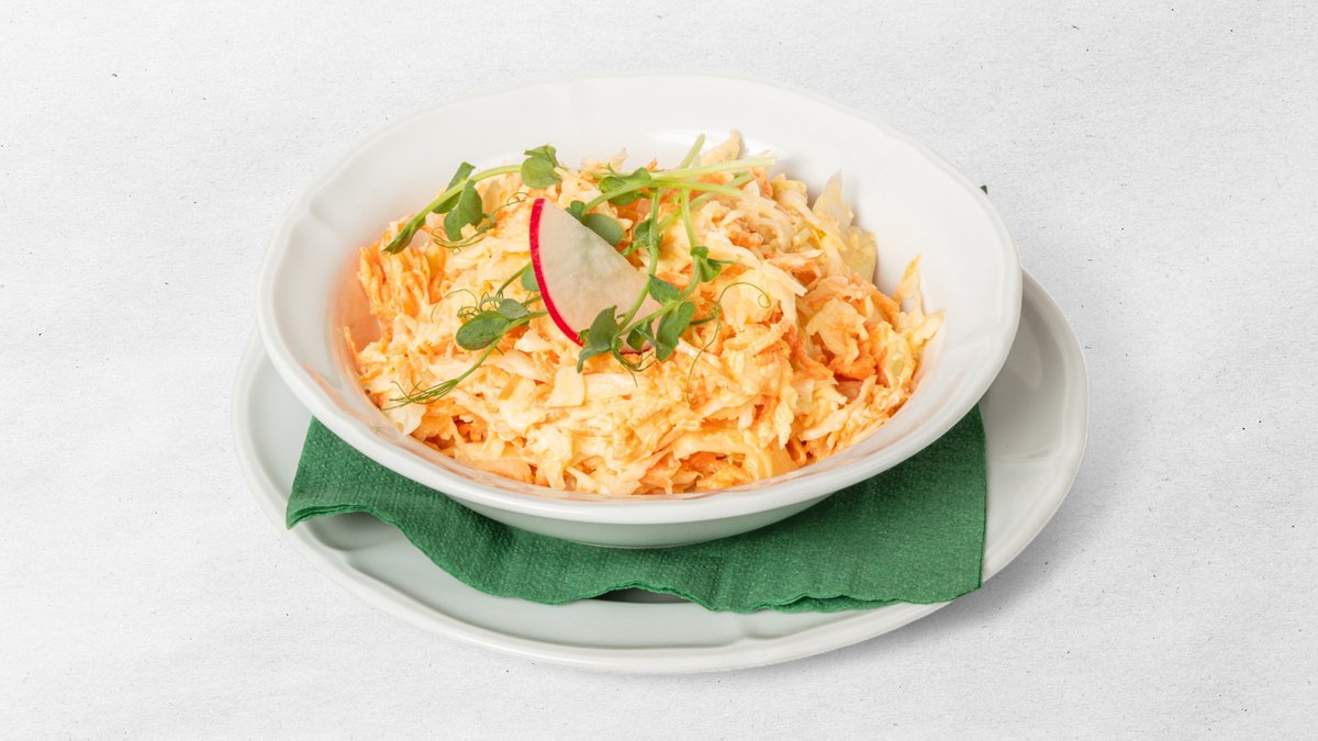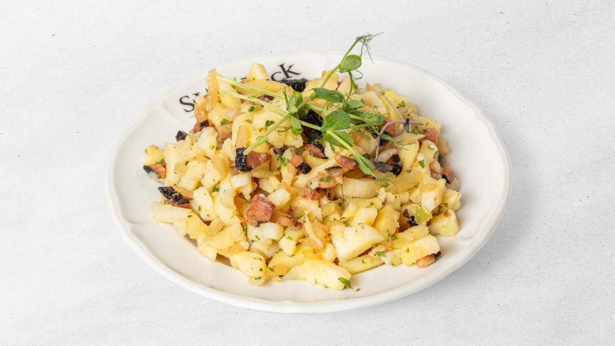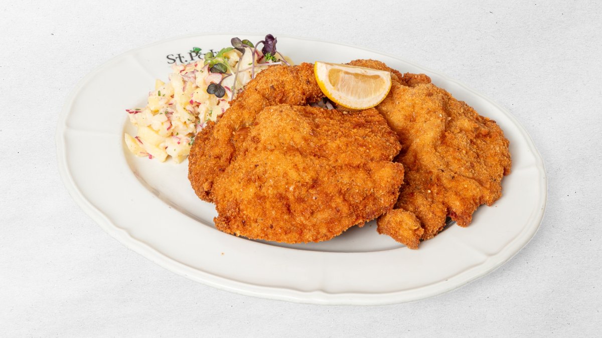 Zjemněný máslem, obalovaný ve strouhance, podávaný s vídeňským bramborovým salátem s červenou cibulí, panenským olejem a vinným octem, 300 g.