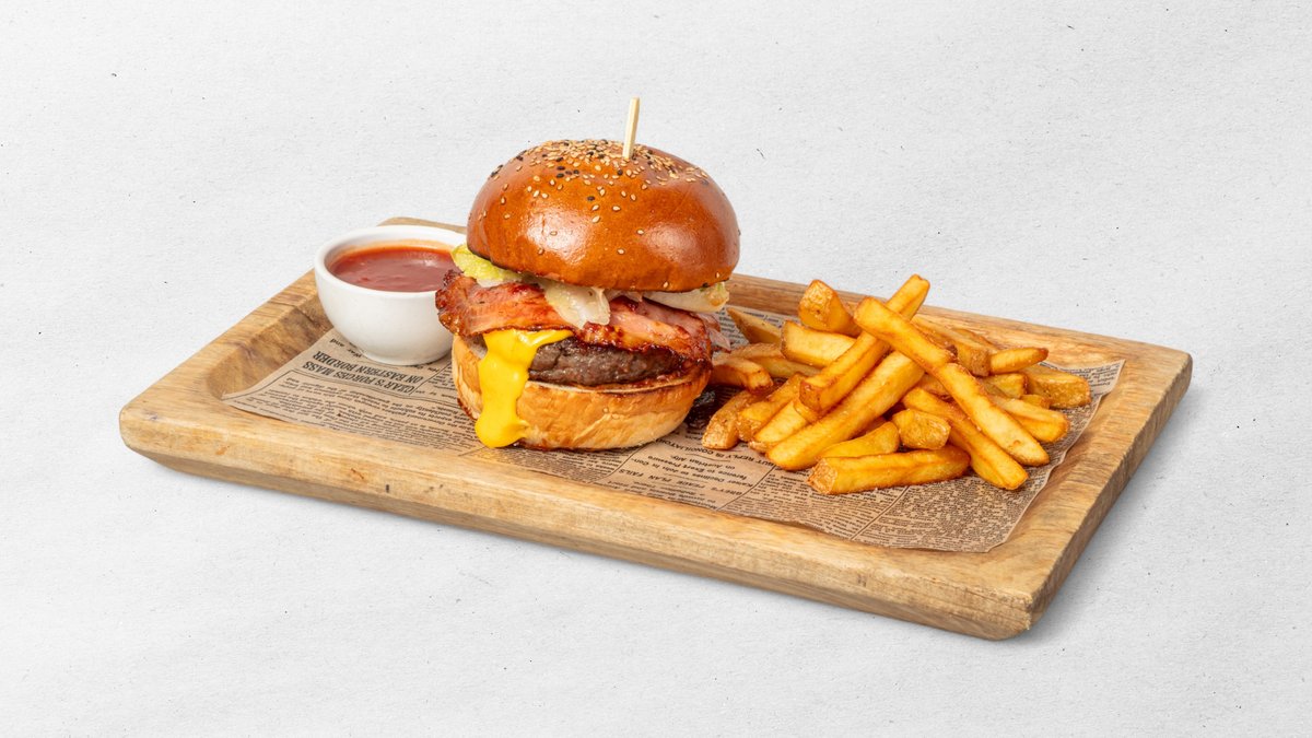 Se slaninou, sýrem, salsou a salátem v naší rozpečené bulce, podávané s hranolky se slupkou.