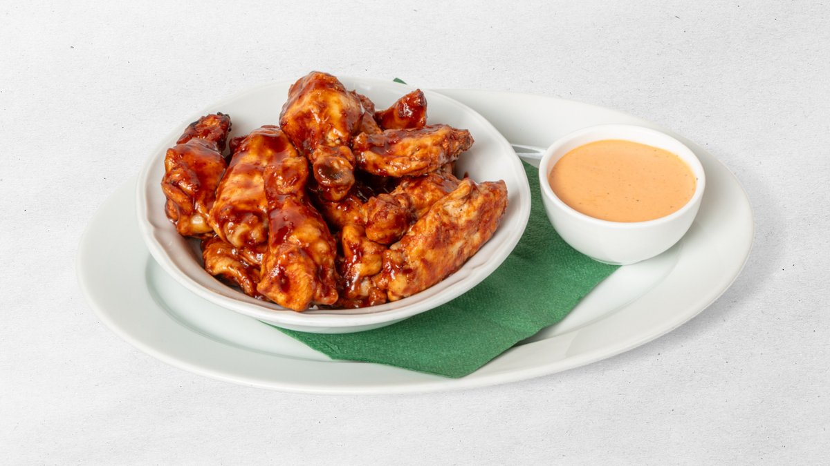 Miska pečených kuřecích křidélek v marinádě dle výběru (BBQ Jameson nebo pikantní chipotle), podávaná s grilovací omáčkou, 400 g.