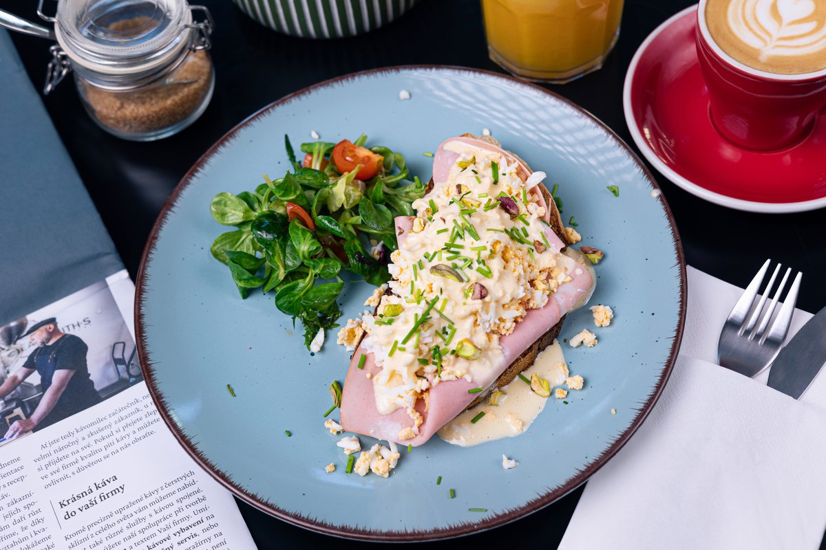 kváskový chleba pomazaný crème fraîche, plátky mortadelly se sekanými pistáciemi a strouhaným vejcem, přelité holandskou omáčkou a čerstvá pažitka.