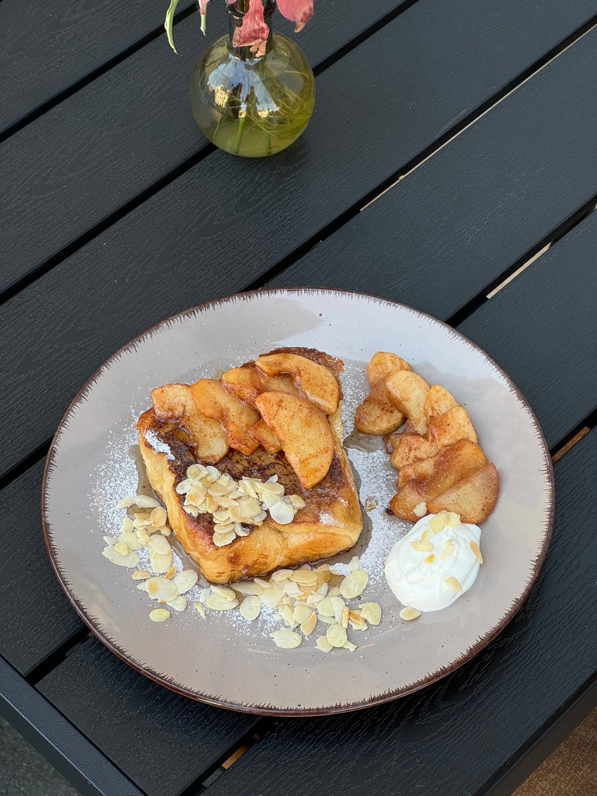 pravá francouzská brioška v mléčném mixu, opečená na přepuštěném másle s karamelizovanými jablky, skořicí, javorový sirup a pražené ořechy.
