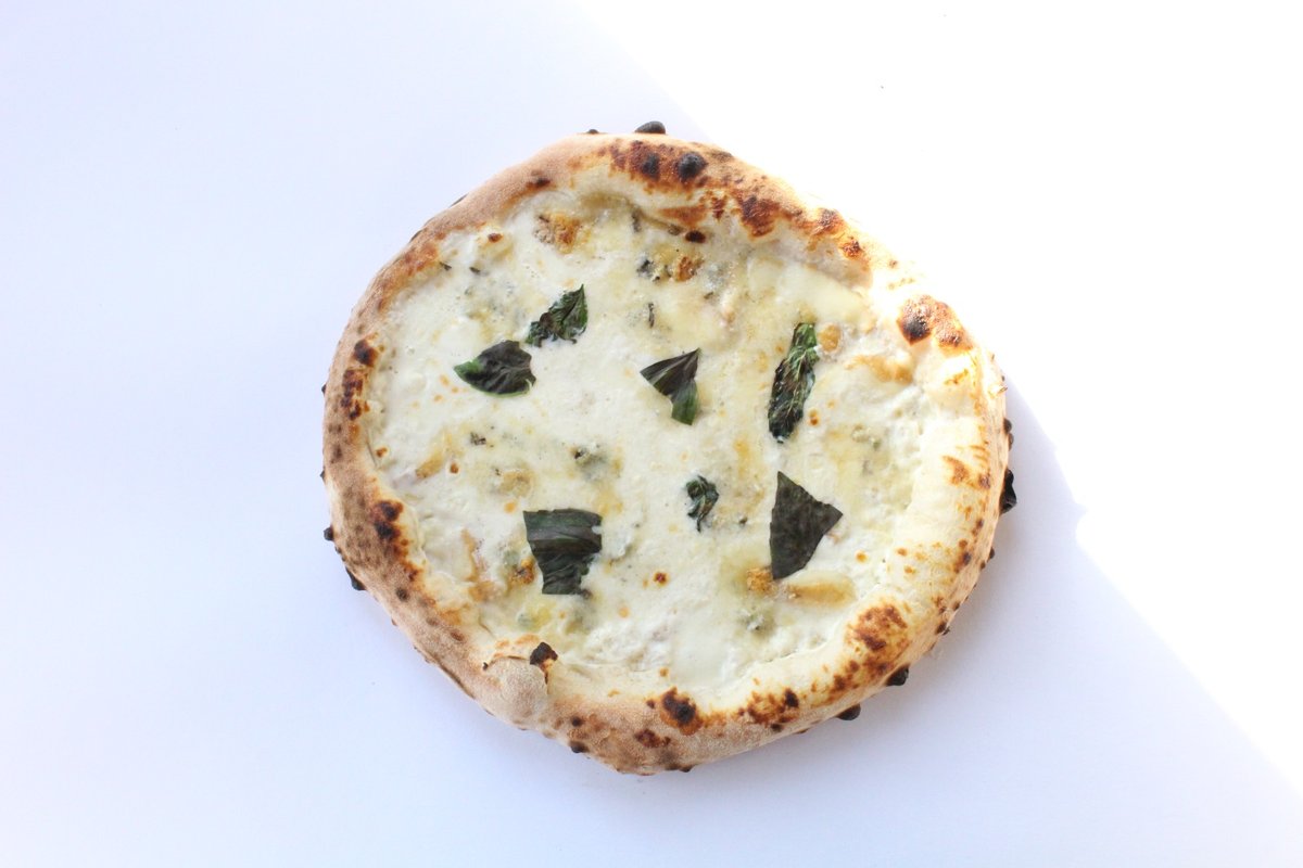 Smetanový základ z ricotty, mozzarella fior di latte, zauzená mozzarella fior di latte, gorgonzola, bazalka, extra panenský olivový olej.