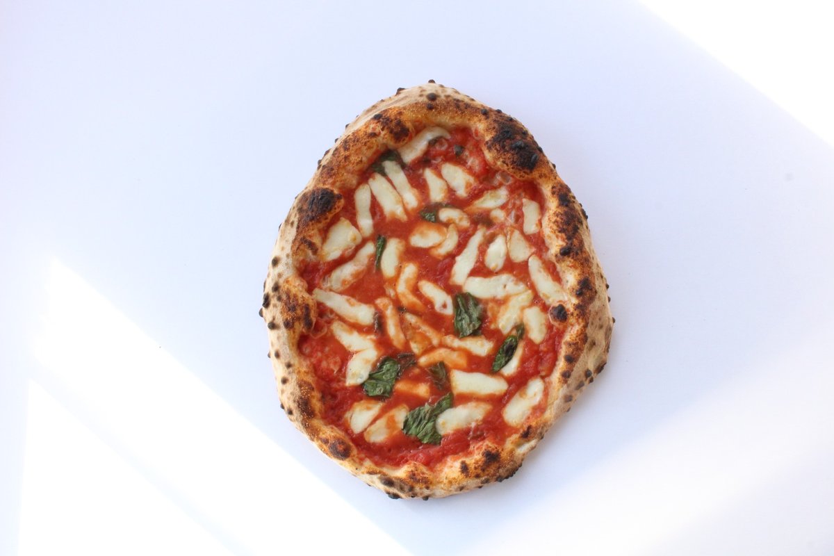 Italská drcená rajčata D.O.P., mozzarella fior di latte, bazalka, extra panenský olivový olej.