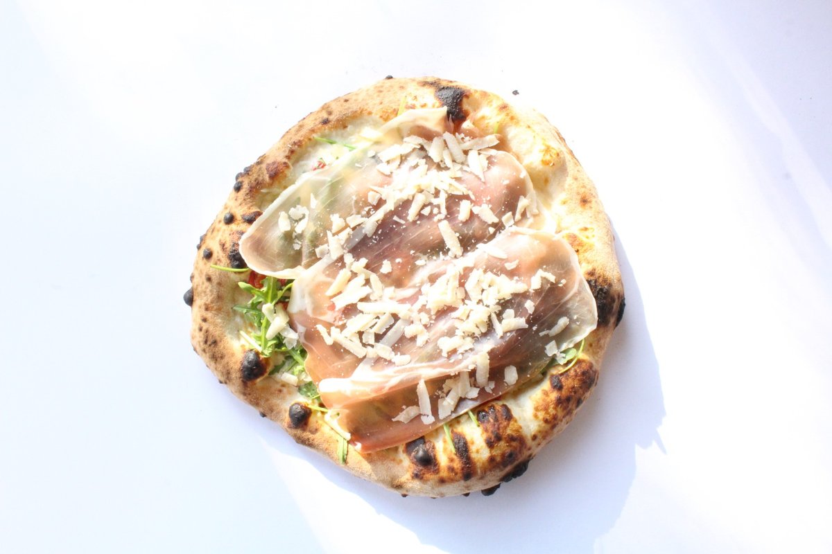 Restovaná cherry rajčata, mozzarella fior di latte, rukola, hoblinky parmezánu, parmská šunka, bazalka, extra panenský olivový olej.