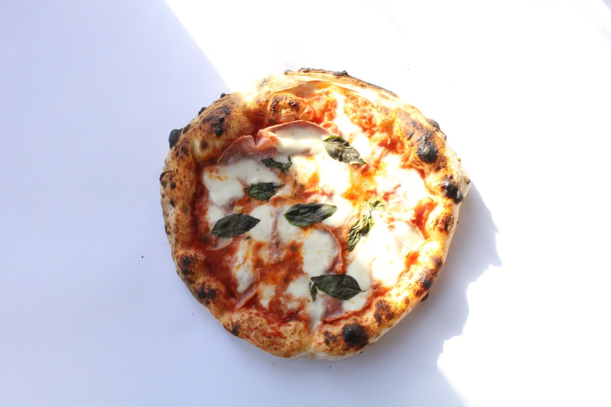 Italská drcená rajčata D.O.P., mozzarella fior di latte, italská dušená šunka, bazalka, extra panenský olivový olej.