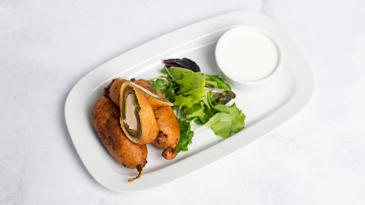 plněné čedarem s dipem ze zakysané smetany a malý trhaný salát