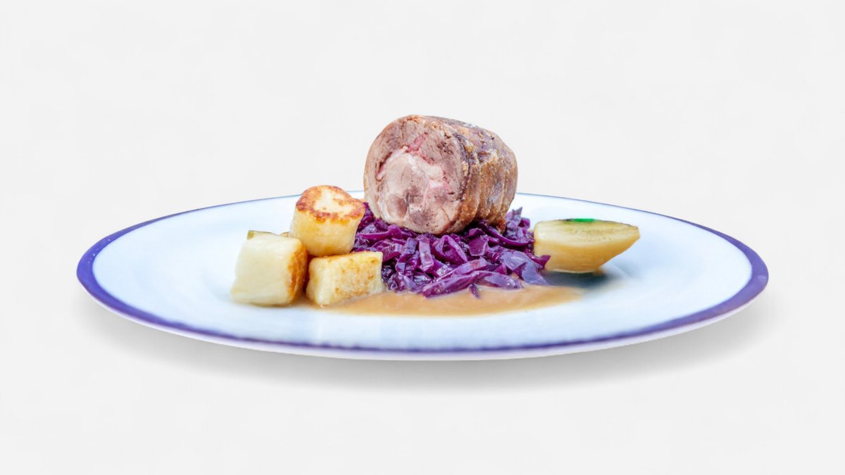 Červené zelí, naše bramborové noky a silná kachní šťáva