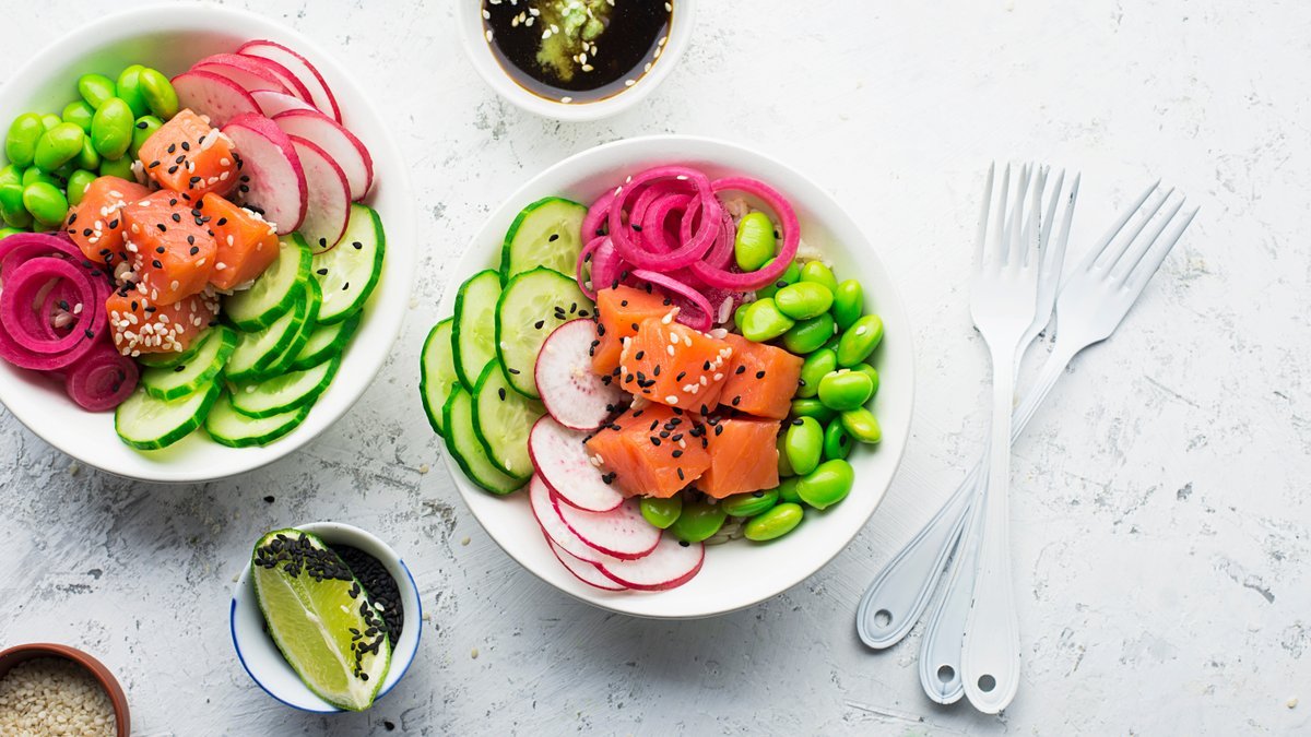 Poke bowl s krůtím trhaným masem z farmy Druhaz, čerstvou zeleninou, hummusem, medovo-hořčičným dresinkem, pečenou cuketou, kulatozrnná rýže
