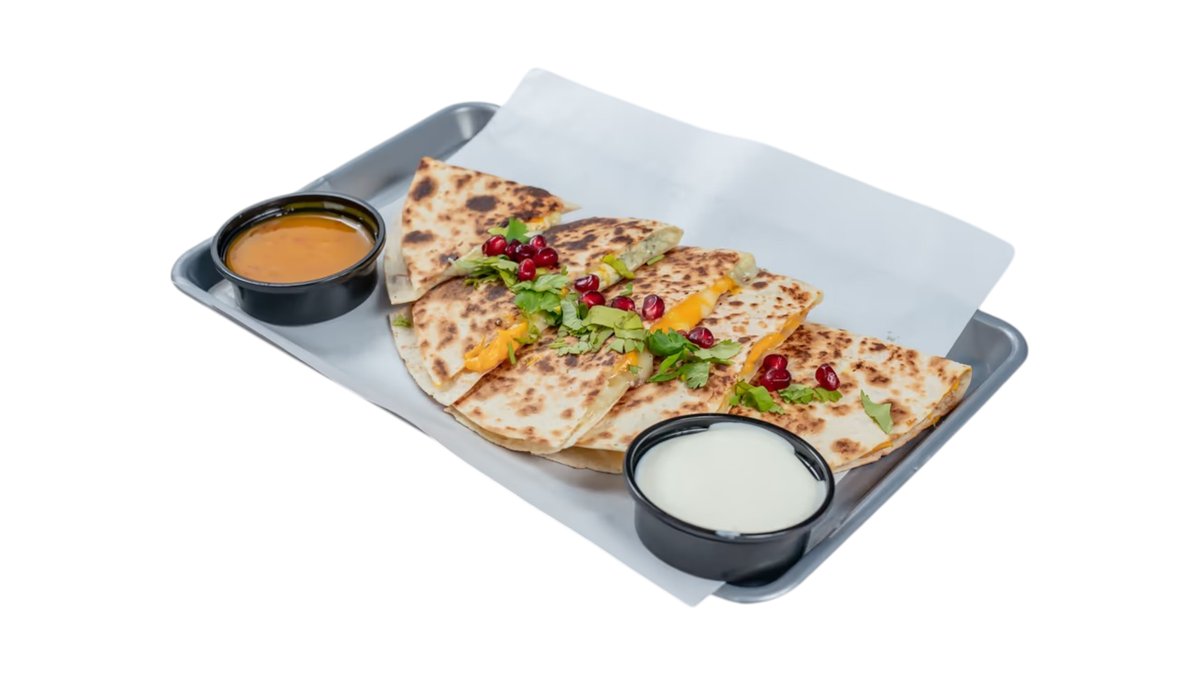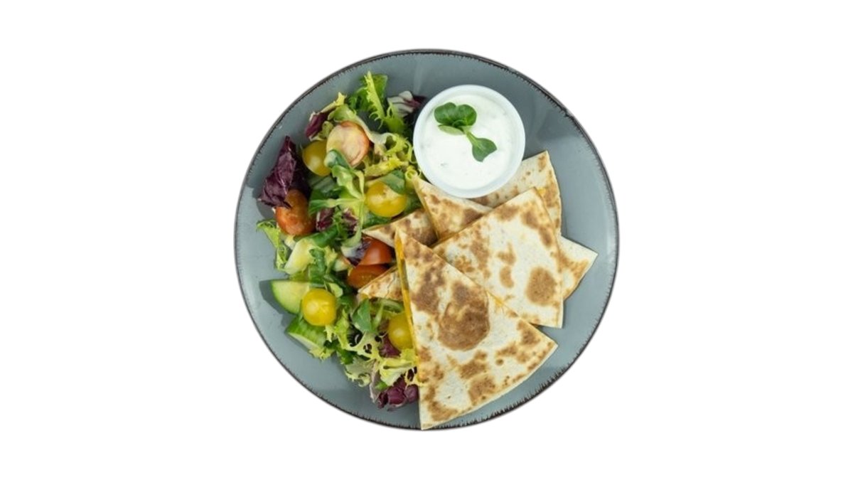 Quesadilla s krůtím trhaným masem a cheddarem, míchaný salát, smetanový dip