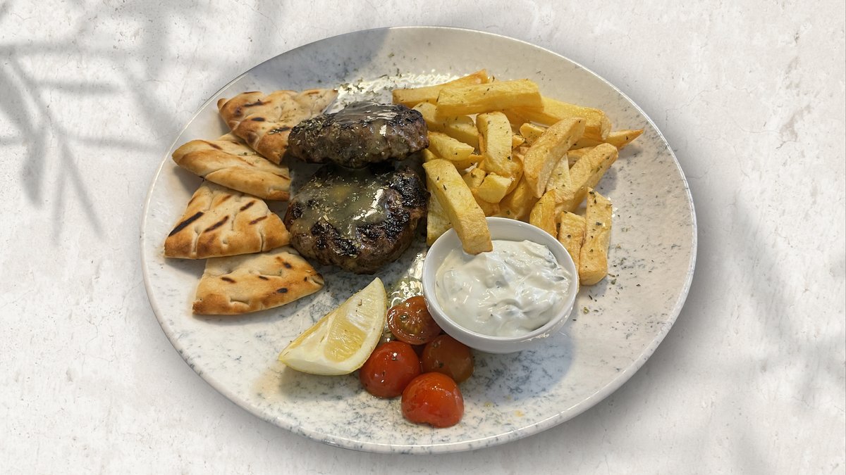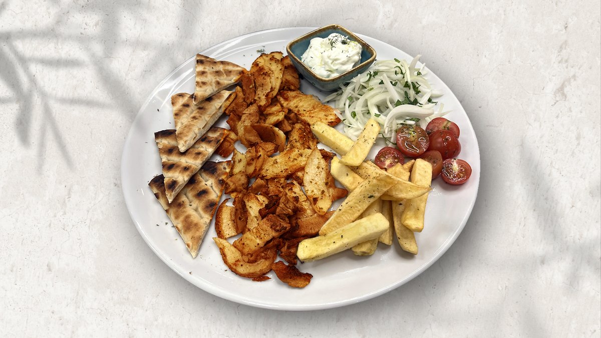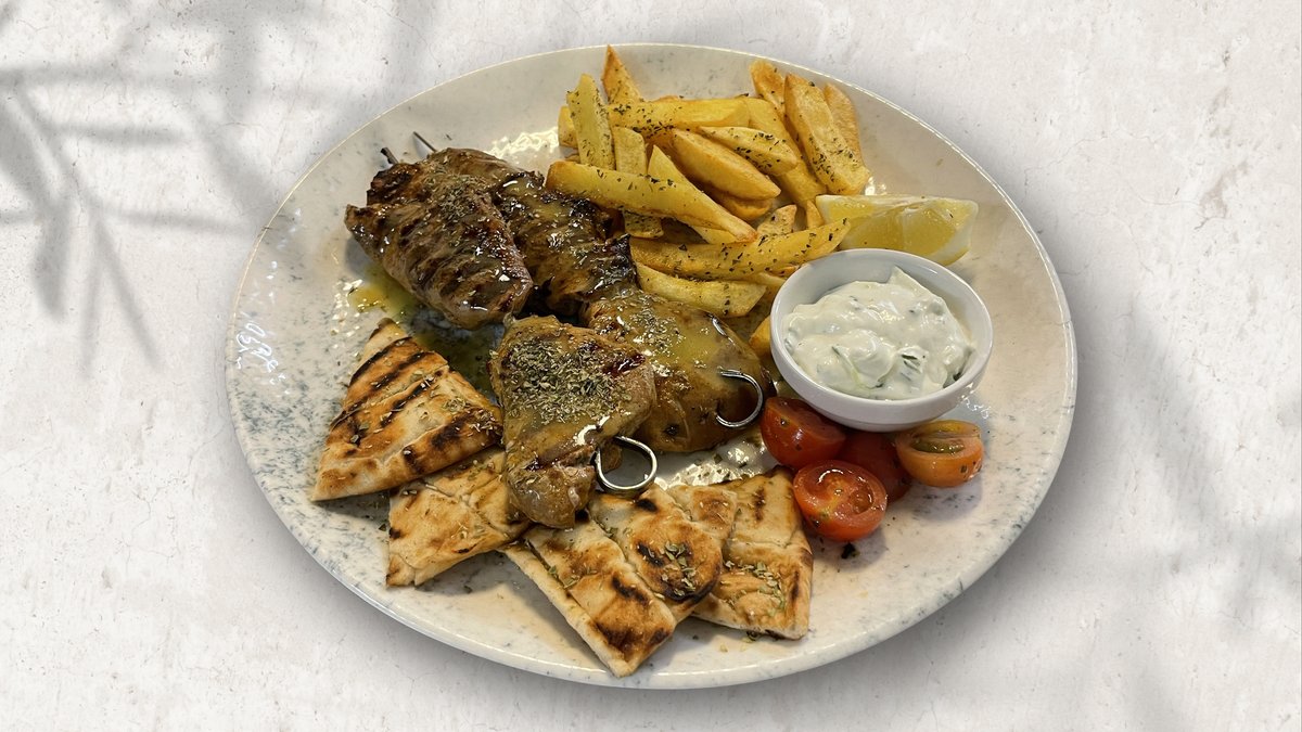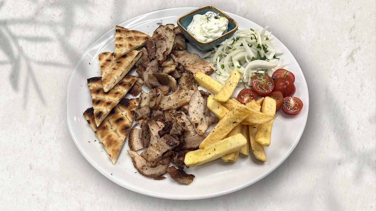 Grilované maso je podáváno s domácími hranolky, tzatziki, cherry rajčaty, rýží basmati a pita chlebem. Gyros z vepřového masa a gyros z kuřecích prsou s cherry rajčaty, cibulí, domácími hranolky a pita chlebem.