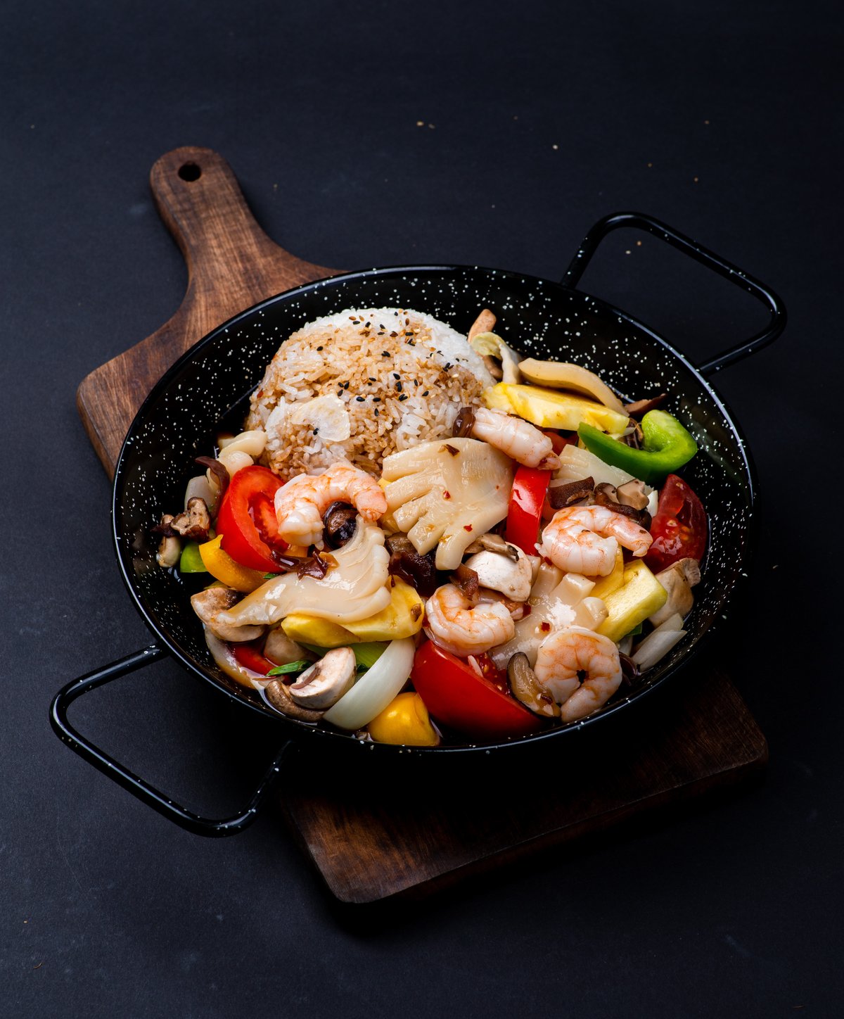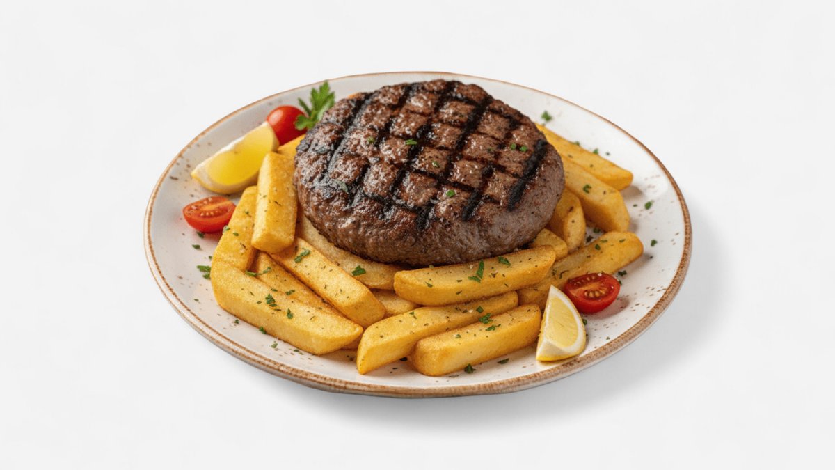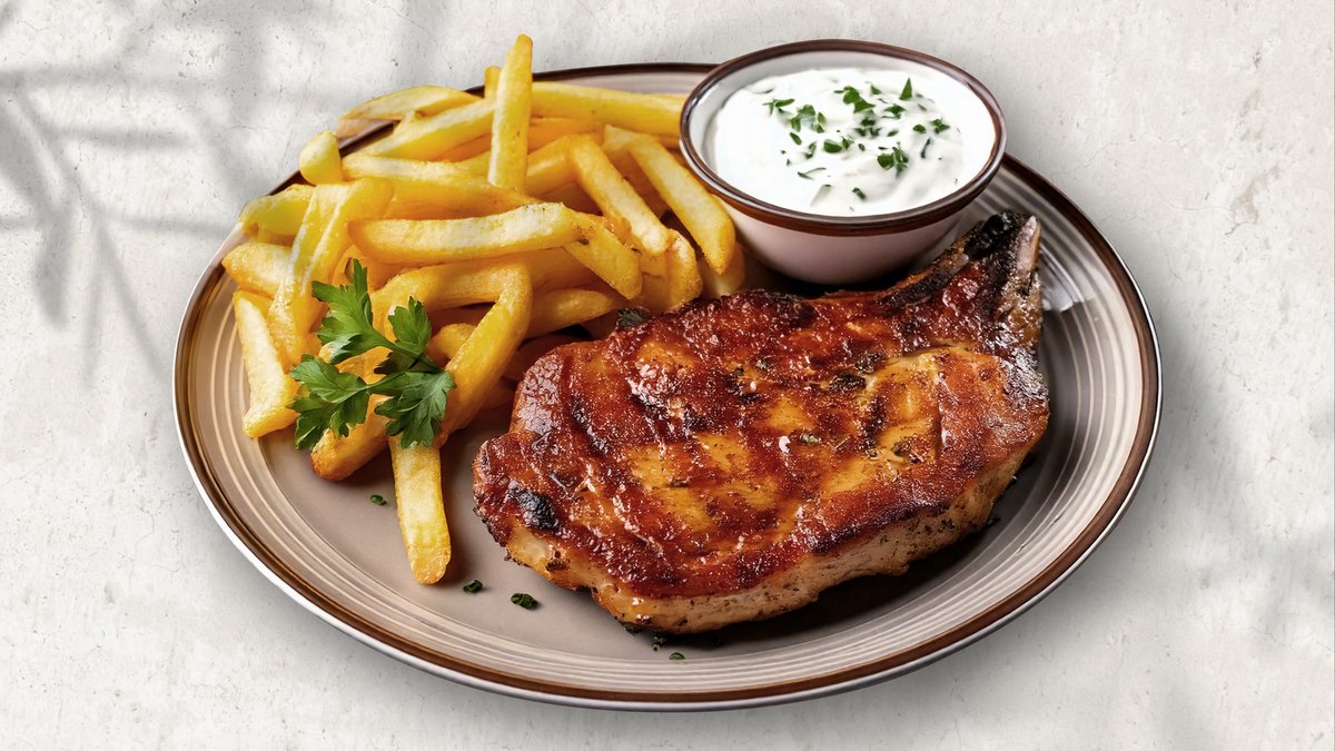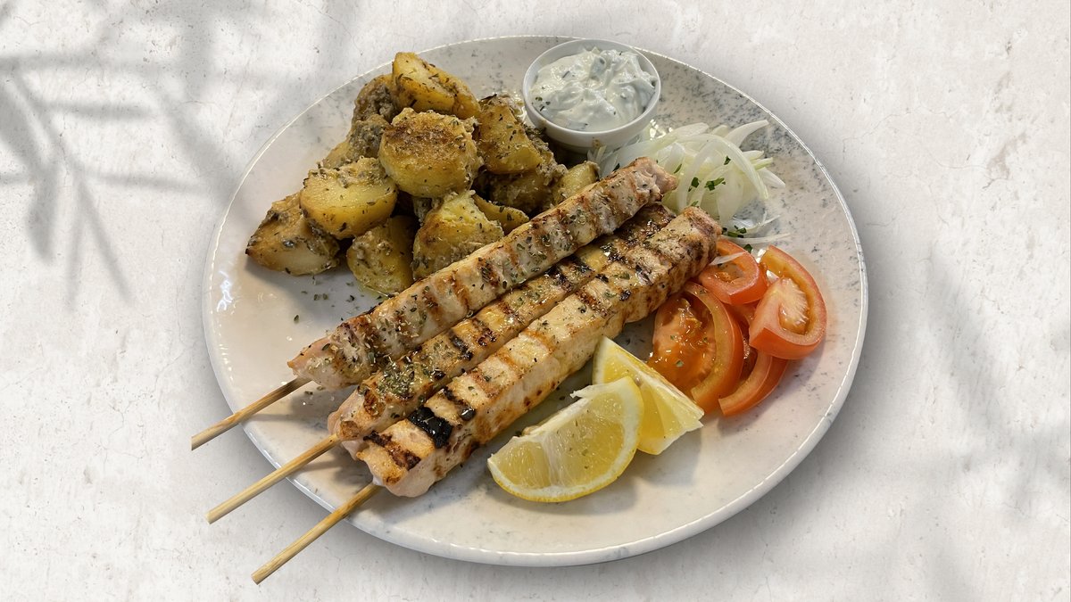 Grilované maso je podáváno s domácími hranolky, tzatziki, cherry rajčaty, rýží basmati a pita chlebem. Gyros z vepřového masa a gyros z kuřecích prsou s cherry rajčaty, cibulí, domácími hranolky a pita chlebem.