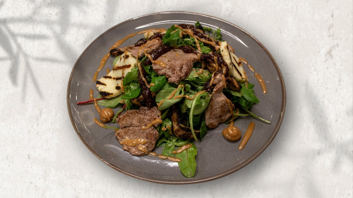 Variace salátů, filírovaná hovězí svíčková, žampiony portobello, grilovaný sýr Haloumi, fíková marmeláda, balsamikový vinaigrette