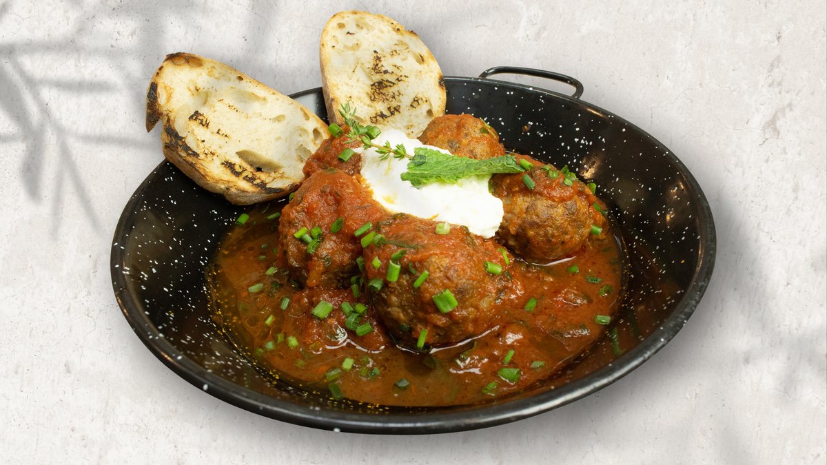 Kuličky z mletého hovězího masa, rajčatová omáčka, sýr Katiki Domokou