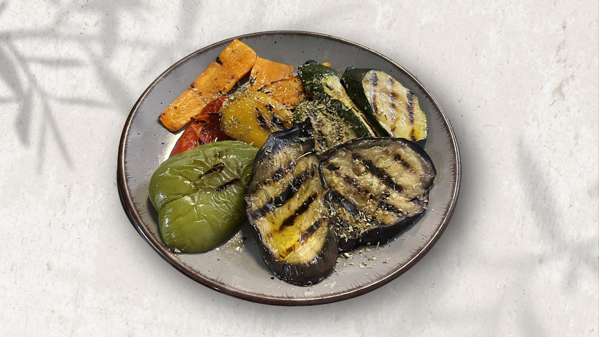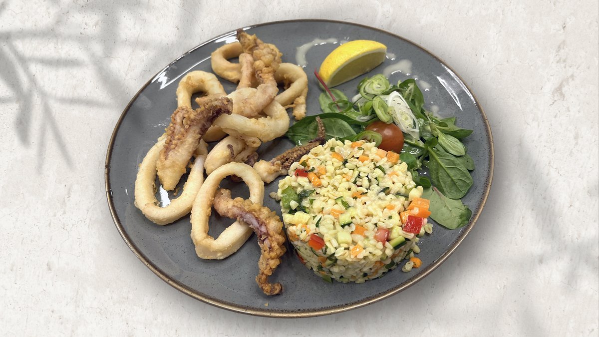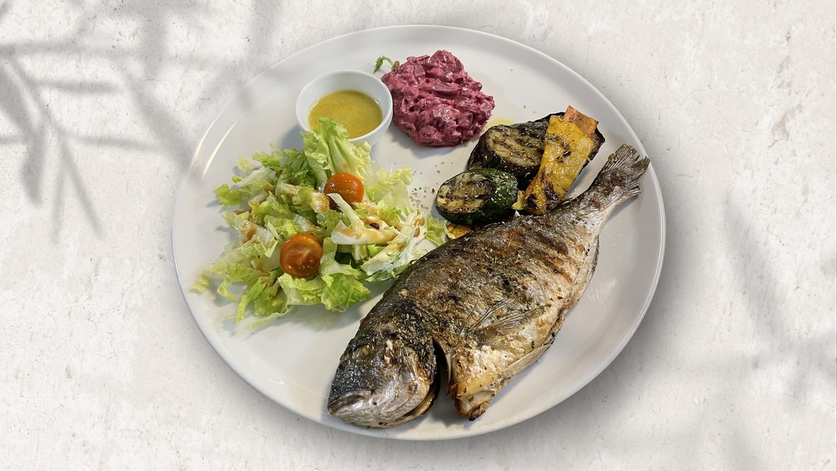 Ryby a plody moře jsou podávány s grilovanou zeleninou, bulgurovým salátem a míchaným zeleninovým salátem.